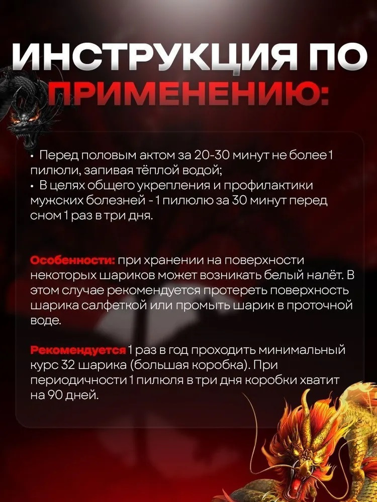 Способ применения: 1/2-1 шарик за 30-40 минут до полового акта, запивая теплой водой (доза зависит от индивидуальных особенностей вашего организма). При незначительных нарушениях или нормальном состоянии, принимайте 1/2 шарика, но не более 1 шарика в сутки. Не совмещать с другими аналогичными препаратами.