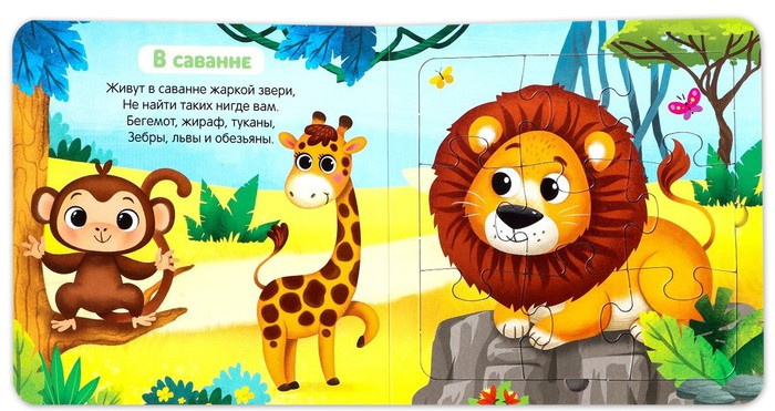 В этой чудной книге малыша ждут не только добрые животные и стихи, но и пазлы. Собирайте их вместе с малышом, чтобы запомнить всех зверей и узнать, где они обитают. Странички книг сделаны из картона, поэтому будут радовать вас и малыша долгое время. Всего в книге 5 ярких пазлов. Рекомендовано для детей от 2 лет. |