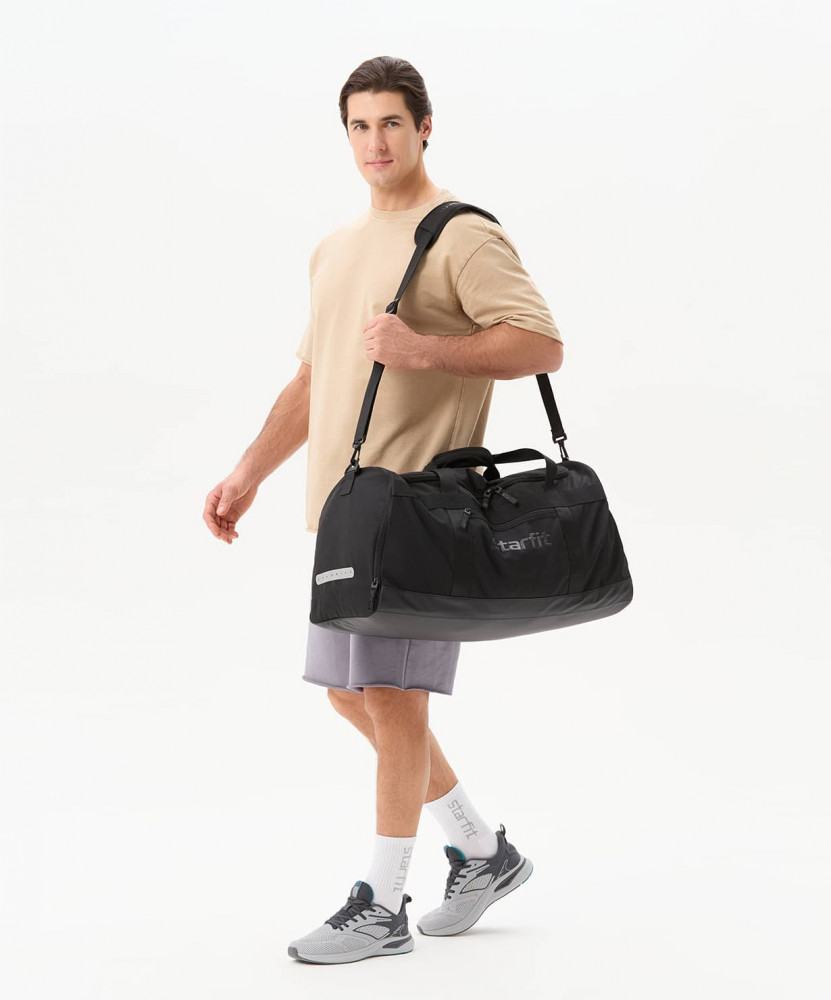 В сумке есть все для удобства использования. Карманы сбоку и спереди застегиваются на молнии, обеспечивая легкий доступ к важным вещам. Специальное вентилируемое отделение для обуви помогает сохранить остальные вещи чистыми, а непромокаемый внутренний карман для влажных вещей защищает от сырости другие аксессуары, которые можно удобно разместить в дополнительных сетчатых карманах. Регулируемый съемный ремень (до 150 см) позволяет подогнать сумку под рост пользователя, при необходимости его легко можно снять. На плечевом ремне и ручках для переноски предусмотрены мягкие накладки, которые избавят от натирания. Изделие дополнено светоотражающими элементами для видимости в темное время суток. Спортивная сумка через плечо универсальна и подойдет как мужчинам, так и женщинам.