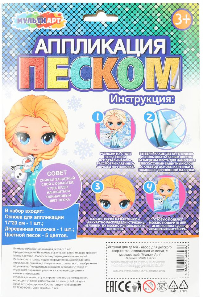 💳 Оплатить за товар можно при получении 🇰🇿 Есть бесплатная доставка по Казахстану 🎁 Копите бонусы с каждой покупки Набор для творчества — аппликация из песка «Принцесса» ТМ «Мульти Арт» — отличный подарок для ребёнка, который будет способствовать развитию его творческих способностей. С помощью красочной основы и разноцветного матового песка маленький художник сможет самостоятельно создать аппликацию с изображением любимых персонажей. Готовую поделку можно подарить близким или использовать для украшения интерьера. |