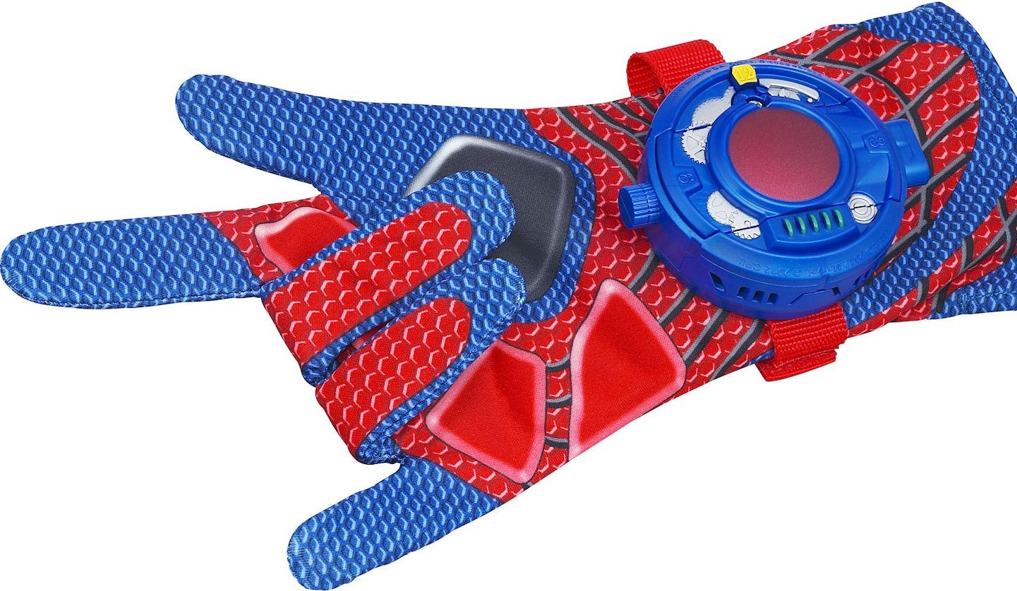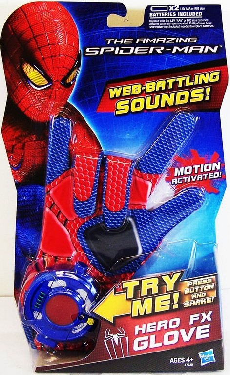 Перчатка Человека-паука со звуковыми эффектами SPIDER-MAN - представляет собой матерчатую эластичную перчатку для правой руки, раскрашенную в точности как перчатка Человека - паука в фильме Новый Человек - паук. На запястье перчатки крепится круглое устройство, издающее звук выстреливаемой паутины. Эмитатор звука "паутиновыстрела" работает от двух мизинчиковых батареек - элемент питания AAA R03, которые входят в комплект данного набора. Работоспособность звукового устройства HASBRO 37225 SPIDER-MAN можно проверить нажатием небольшой желтой кнопочки с цифрой "12".