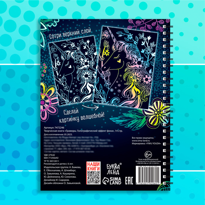 💳 Оплатить за товар можно при получении 🇰🇿 Есть бесплатная доставка по Казахстану от 1 дня 🎁 Копите бонусы с каждой покупки Гравюра — древнее искусство, получившее своё распространение ещё несколько столетий тому назад, а теперь доступное даже ребёнку. Техника гравюры особенная, невероятно увлекательная, но при этом достаточно простая. Что представляет собой гравюра. Это многослойное панно, покрытое чёрной краской с нанесённым контуром рисунка. Как создать гравюру. Чтобы сделать гравюру, нужно просто стирать верхний слой с помощью пластикового штихеля, который входит в набор. В книге вы найдёте 10 гравюр и интересные задания «найди и покажи». У гравюры красная основа, которая переливается. Рекомендовано для детей от 6 лет. |
