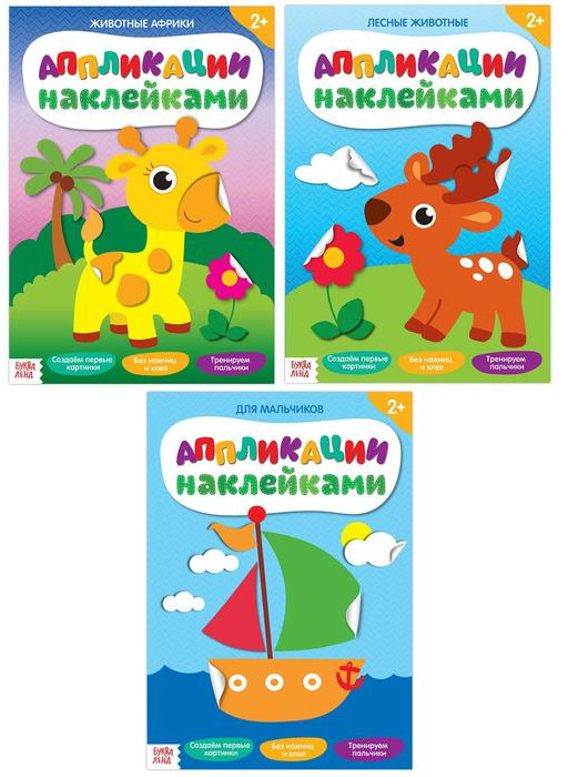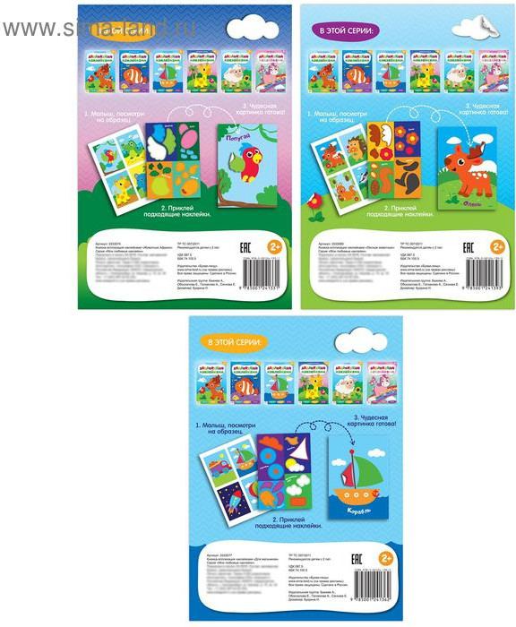 Делаем аппликации своими рукамиВ данный момент этот товар отсутствует в продаже. Возможно, у нас найдется аналогичный или похожий товар здесь. Аппликации наклейками помогут малышам создавать свои первые поделки. Они делаются легко и просто — без клея и ножниц, нужно просто наклеивать фигурки на основу. Во время таких творческих занятий у деток тренируется моторика пальчиков, аккуратность и усидчивость. Рекомендовано для детей от 2 лет. |