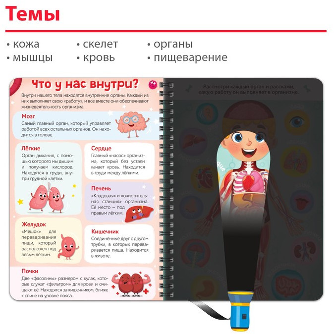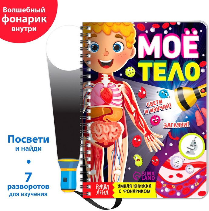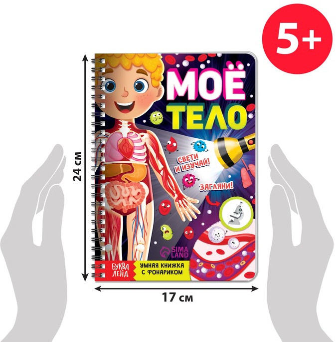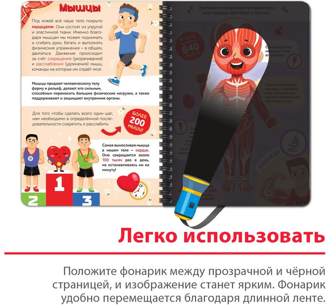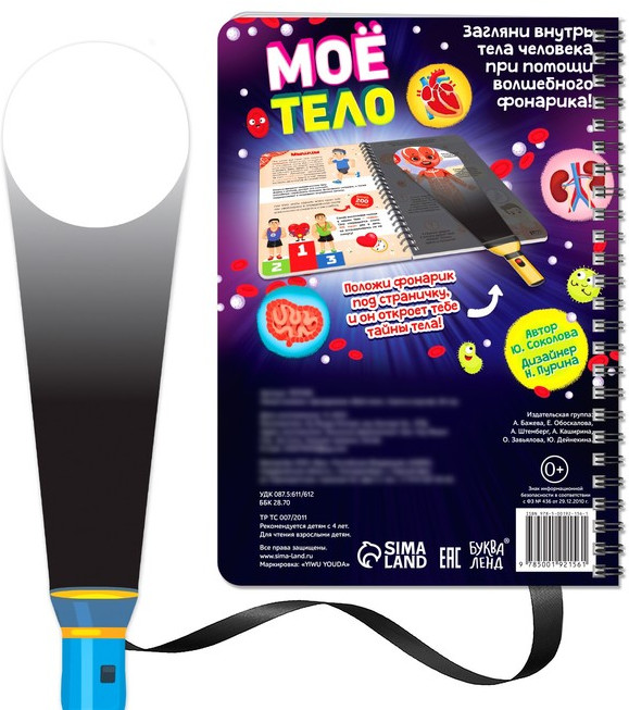 Книга с фонариком «Моё тело. Свети и изучай»В данный момент этот товар отсутствует в продаже. Возможно, у нас найдется аналогичный или похожий товар здесь. С умной книжкой «Моё тело» ребёнок узнает, как устроен человеческий организм и как работают все наши органы и системы. Выполняйте задания, ищите подсказки с помощью фонарика и узнавайте много нового вместе с малышом. Как разглядеть подсказки на страницах книжки. Возьмите фонарик и вложите его под страничку с чёрными элементами. Вы получите яркое изображение на пластиковой странице, где размещаете белую часть фонарика (луч).Остальные части страницы (не под фонариком) остаются в тени. Издание рекомендовано для детей старше 4 лет. |