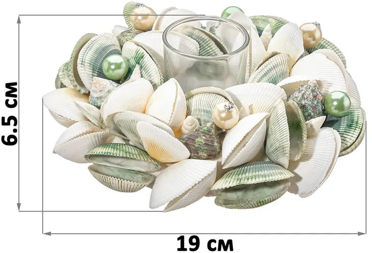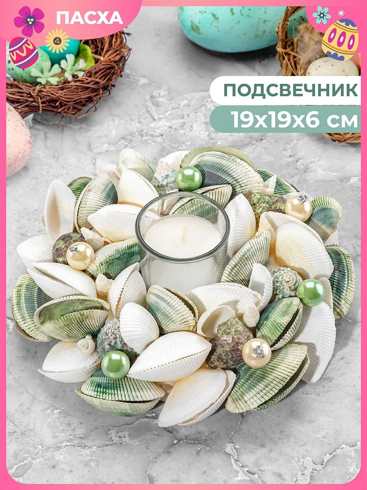 Подсвечник «Ракушки с жемчугом» на 1 свечу станет оригинальным дополнением вашего интерьера. Размер изделия — 19×19×6,5 см, диаметр подсвечника — 3,5 см. Глубокая ёмкость выполнена в форме классической чашечки и подойдёт как для чайных свечей, так и для свечей-столбиков. Высокие стенки не допустят протечки воска. Необычное декоративное изделие представляет собой композицию из белых и зелёных ракушек разных форм с вкраплением больших и маленьких бусин, имитирующих жемчужины. Светлая Пасха — один из главных праздников весны! Мы разработали коллекцию сезонных товаров для дома, которые помогут создать радостную и уютную атмосферу в квартире или на даче. Пасхальный декор преобразит домашний интерьер и поможет встретить праздник в кругу любимых. Поставьте изделие на стол, полку или подоконник, чтобы оно всегда было на виду и радовало глаз. Сделайте частью праздничного стола, чтобы привнести ощущение чуда. Зажгите свечу и насладитесь неторопливым вечером в компании книг, фильма или душистого напитка, чтобы отдохнуть. Необычный элемент декора найдёт место в любой части вашей квартиры: в прихожей, гостиной, столовой или спальне. Отлично дополнит ванную комнату, поможет расслабиться и навеет мысли о морском побережье. Избегайте прямого контакта с водой! Это изящный и лёгкий способ добавить эстетики любому помещению. В коллекции бренда Elan Gallery вы найдёте множество как ярких, так и нежных декоративных украшений — каждый обязательно подберёт сувенир на свой вкус. Они станут чудесным подарком для родных, близких и коллег. Наполните пространство вокруг себя радостью и весенним настроением!