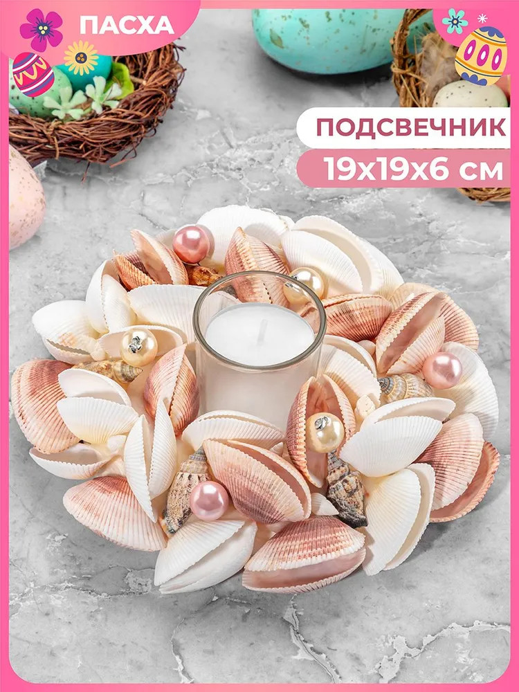 Подсвечник «Ракушки с жемчугом» на 1 свечу станет оригинальным дополнением вашего интерьера. Размер изделия — 19×19×6,5 см, диаметр подсвечника — 3,5 см. Глубокая ёмкость выполнена в форме классической чашечки и подойдёт как для чайных свечей, так и для свечей-столбиков. Высокие стенки не допустят протечки воска. Необычное декоративное изделие представляет собой композицию из белых и розовых ракушек разных форм с вкраплением больших и маленьких бусин, имитирующих жемчужины. Светлая Пасха — один из главных праздников весны! Мы разработали коллекцию сезонных товаров для дома, которые помогут создать радостную и уютную атмосферу в квартире или на даче. Пасхальный декор преобразит домашний интерьер и поможет встретить праздник в кругу любимых. Поставьте изделие на стол, полку или подоконник, чтобы оно всегда было на виду и радовало глаз. Сделайте частью праздничного стола, чтобы привнести ощущение чуда. Зажгите свечу и насладитесь неторопливым вечером в компании книг, фильма или душистого напитка, чтобы отдохнуть. Необычный элемент декора найдёт место в любой части вашей квартиры: в прихожей, гостиной, столовой или спальне. Отлично дополнит ванную комнату, поможет расслабиться и навеет мысли о морском побережье. Избегайте прямого контакта с водой! Это изящный и лёгкий способ добавить эстетики любому помещению. В коллекции бренда Elan Gallery вы найдёте множество как ярких, так и нежных декоративных украшений — каждый обязательно подберёт сувенир на свой вкус. Они станут чудесным подарком для родных, близких и коллег. Наполните пространство вокруг себя радостью и весенним настроением!