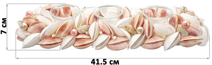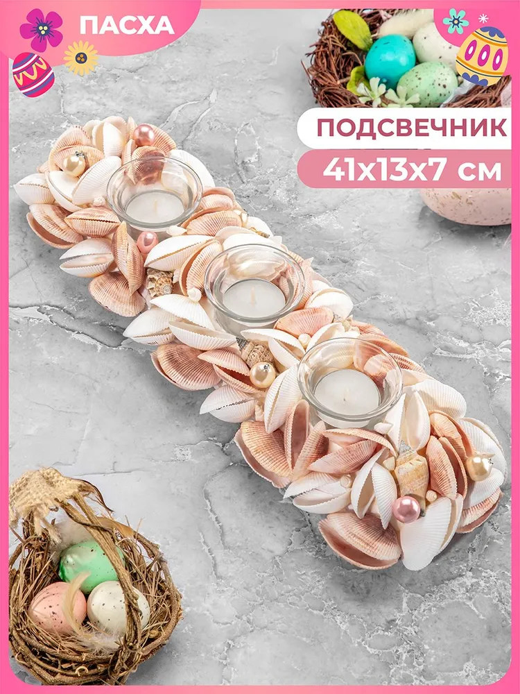 Подсвечник «Ракушки с жемчугом» на 3 свечи станет оригинальным дополнением вашего интерьера. Размер изделия — 41,5×13,5×7 см, диаметр каждого подсвечника — 3,5 см. Глубокие ёмкости выполнены в форме классической чашечки и подойдут как для чайных свечей, так и для свечей-столбиков. Высокие стенки не допустят протечки воска. Необычное декоративное изделие представляет собой композицию из белых и розовых ракушек разных форм с вкраплением больших и маленьких бусин, имитирующих жемчужины. Светлая Пасха — один из главных праздников весны! Мы разработали коллекцию сезонных товаров для дома, которые помогут создать радостную и уютную атмосферу в квартире или на даче. Пасхальный декор преобразит домашний интерьер и поможет встретить праздник в кругу любимых. Поставьте изделие на стол, полку или подоконник, чтобы оно всегда было на виду и радовало глаз. Сделайте частью праздничного стола, чтобы привнести ощущение чуда. Зажгите свечи и насладитесь неторопливым вечером в компании книг, фильма или душистого напитка, чтобы отдохнуть. Необычный элемент декора найдёт место в любой части вашей квартиры: в прихожей, гостиной, столовой или спальне. Отлично дополнит ванную комнату, поможет расслабиться и навеет мысли о морском побережье. Избегайте прямого контакта с водой! Это изящный и лёгкий способ добавить эстетики любому помещению. В коллекции бренда Elan Gallery вы найдёте множество как ярких, так и нежных декоративных украшений — каждый обязательно подберёт сувенир на свой вкус. Они станут чудесным подарком для родных, близких и коллег. Наполните пространство вокруг себя радостью и весенним настроением!