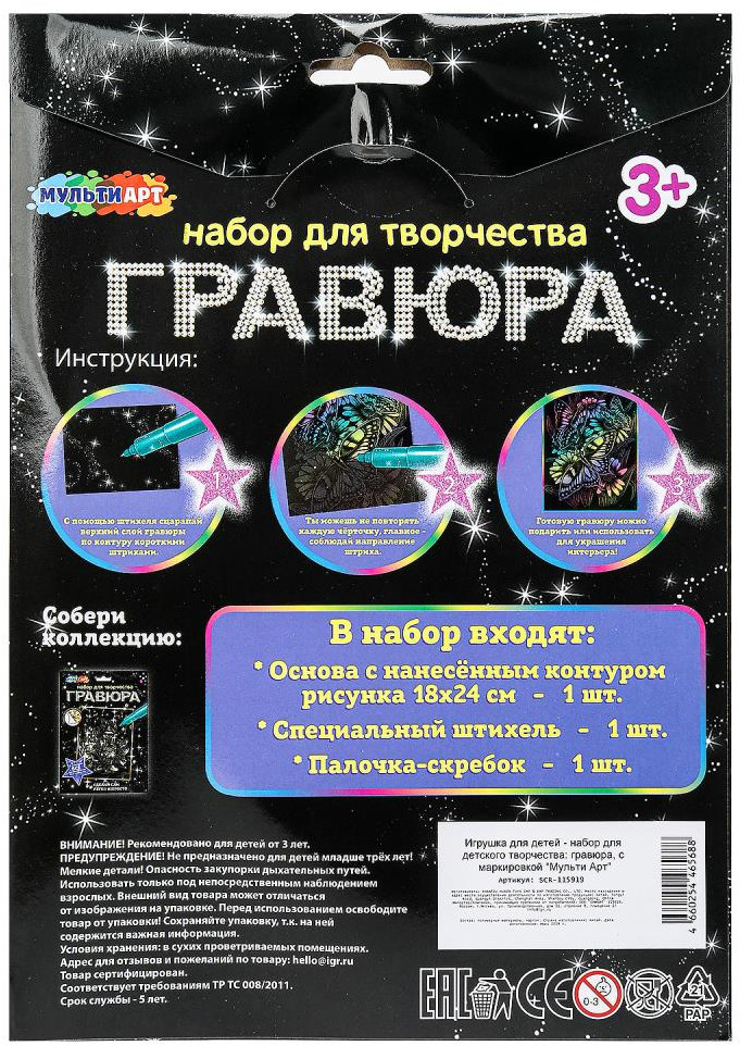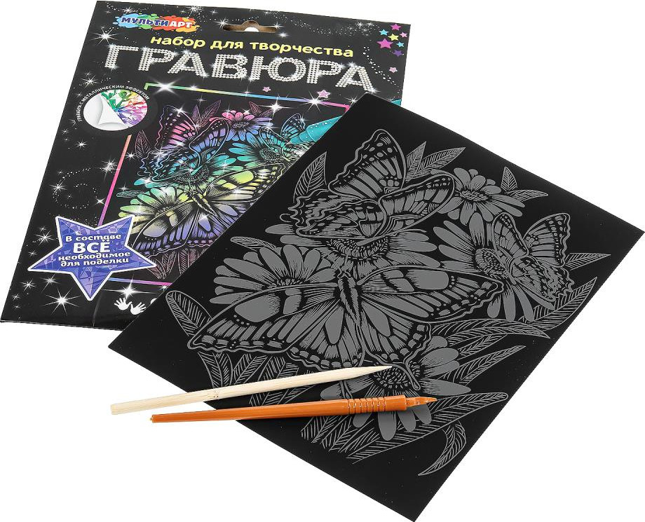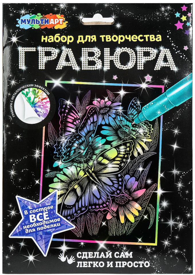 💳 Оплатить за товар можно при получении 🇰🇿 Есть бесплатная доставка по Казахстану от 1 дня 🎁 Копите бонусы с каждой покупки Набор для творчества «Гравюра. Бабочки» ТМ «Мульти Арт» — отличный подарок для ребёнка, который будет способствовать развитию его творческих способностей. С помощью данного набора юный художник сможет создать эффектную цветную картину на чёрном фоне. Контур рисунка уже нанесён на основу, остаётся только процарапать изображение специальным штихелем. Готовую поделку можно подарить близким или использовать для украшения интерьера. |