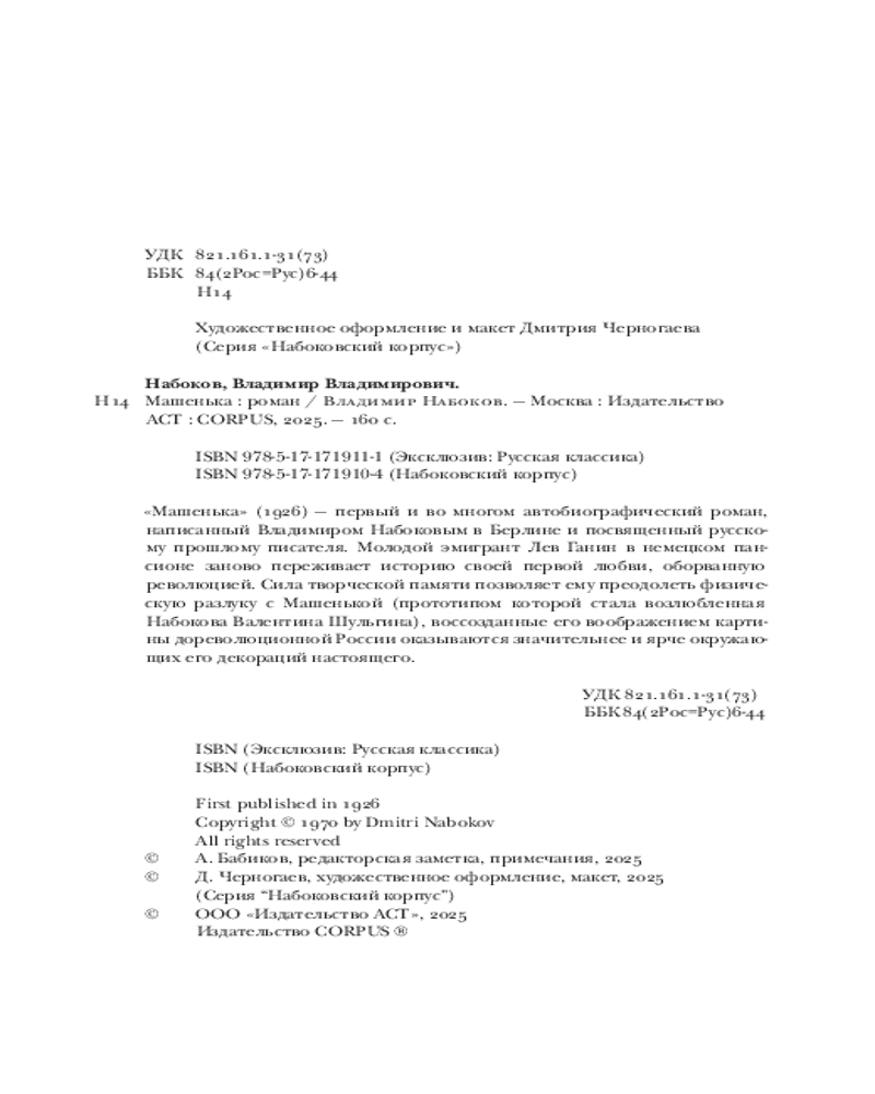 💳 Оплатить за товар можно при получении 🇰🇿 Есть бесплатная доставка по Казахстану от 1 дня 🎁 Копите бонусы с каждой покупки Серия: Эксклюзив: Русская классика «Машенька» (1926) — первый и во многом автобиографический роман, написанный Владимиром Набоковым в Берлине и посвященный русскому прошлому писателя. Молодой эмигрант Лев Ганин в немецком пансионе заново переживает историю своей первой любви, оборванную революцией. Сила творческой памяти позволяет ему преодолеть физическую разлуку с Машенькой (прототипом которой стала возлюбленная |