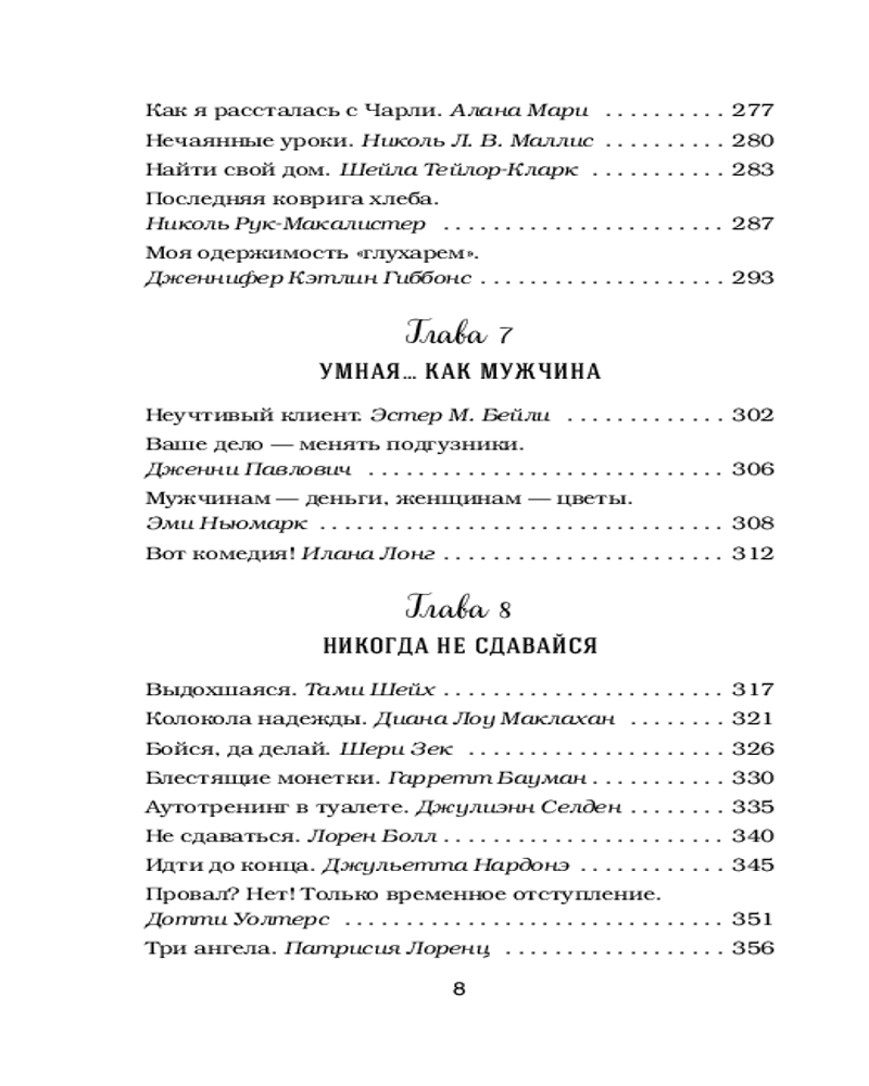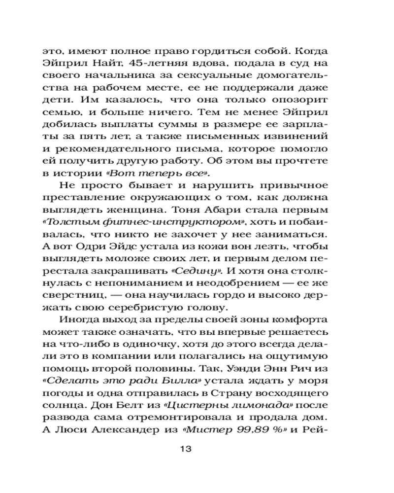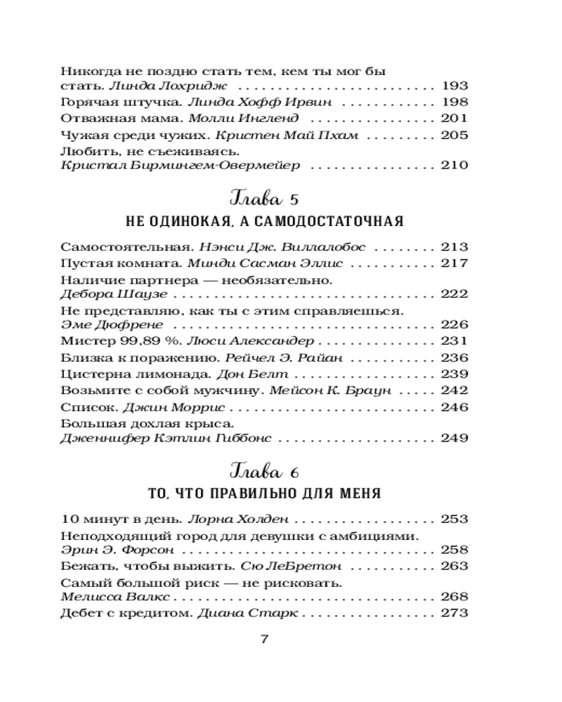 В данный момент этот товар отсутствует в продаже. Возможно, у нас найдется аналогичный или похожий товар здесь. Серия: Куриный бульон для души. Карманный формат Героини этого сборника танцуют, не дожидаясь, пока закончится дождь. Сталкиваясь с предательством мужчины, учатся забивать гвозди и по-прежнему считают себя желанными. Борются с болезнью с помощью кошек и творчества. А с неуверенностью в себе — с помощью красной помады. Отказываются от головокружительной карьеры ради детей. И все равно потом становятся успешными. Удивительные, ранимые, смелые, они рассказывают, как годами жили внутри очерченных кем-то границ. И как трудно, непривычно и прекрасно оказалось снаружи. |
