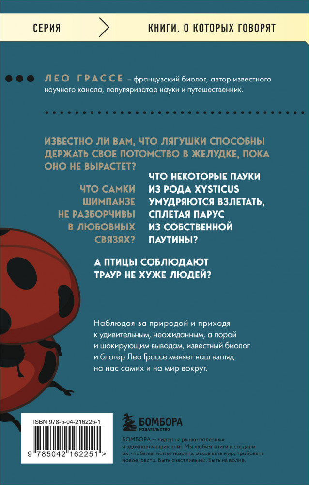 💳 Оплатить за товар можно при получении 🇰🇿 Есть бесплатная доставка по Казахстану от 1 дня 🎁 Копите бонусы с каждой покупки Серия: Книги, о которых говорят Известно ли вам, что лягушки способны держать свое потомство в желудке, пока оно не вырастет? Что некоторые пауки из рода Xysticus умудряются взлетать, сплетая парус из собственной паутины? Что самки шимпанзе неразборчивы в любовных связях? А птицы соблюдают траур не хуже людей? Наблюдая за природой и приходя к удивительным, неожиданным, а порой и шокирующим выводам, известный биолог и блогер Лео Грассе меняет наш взгляд на нас самих и на мир вокруг. |