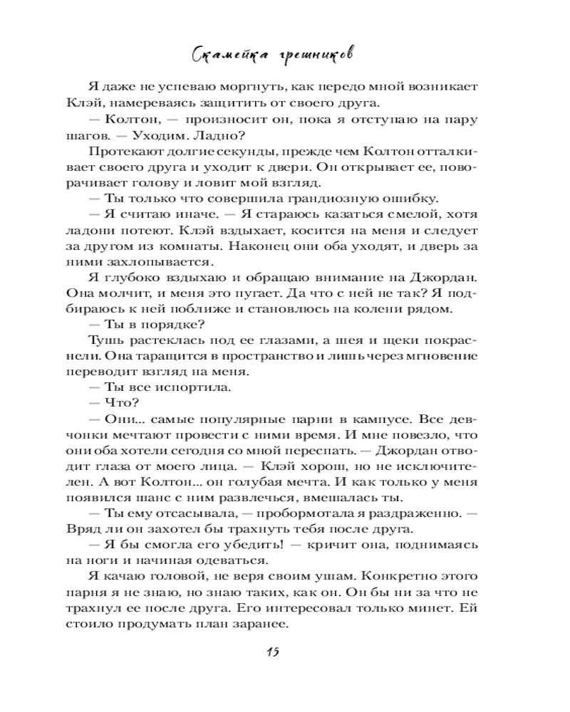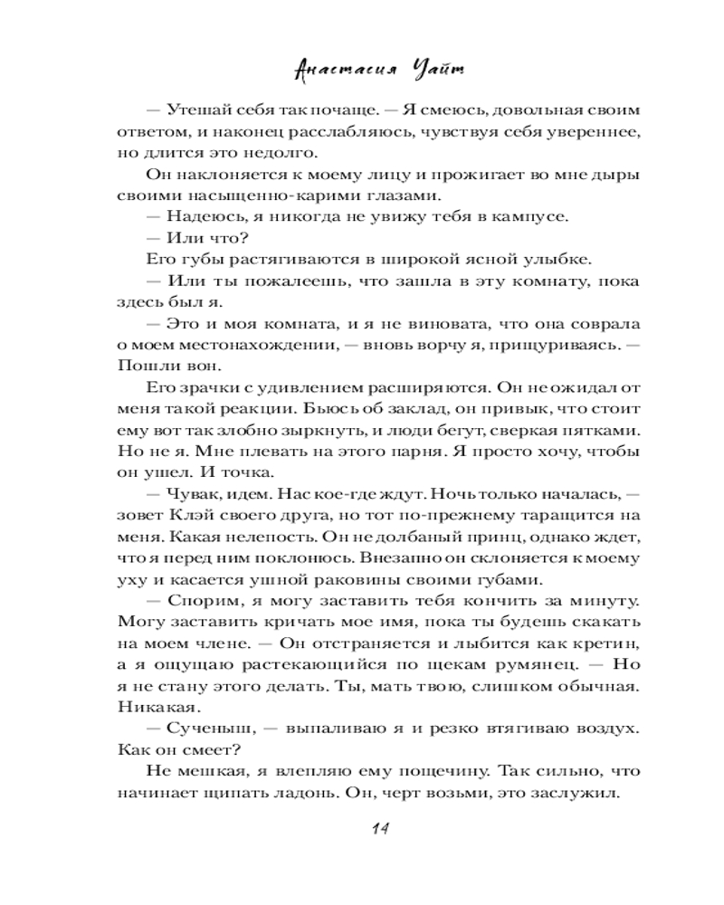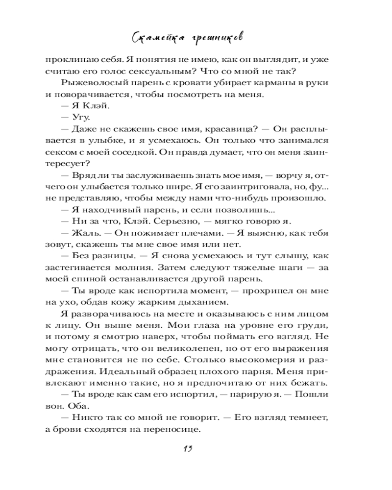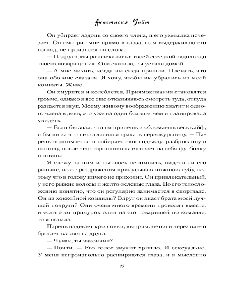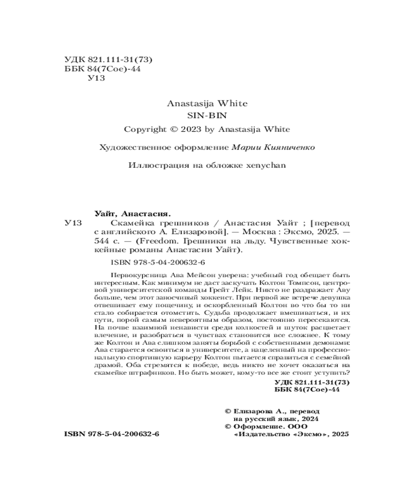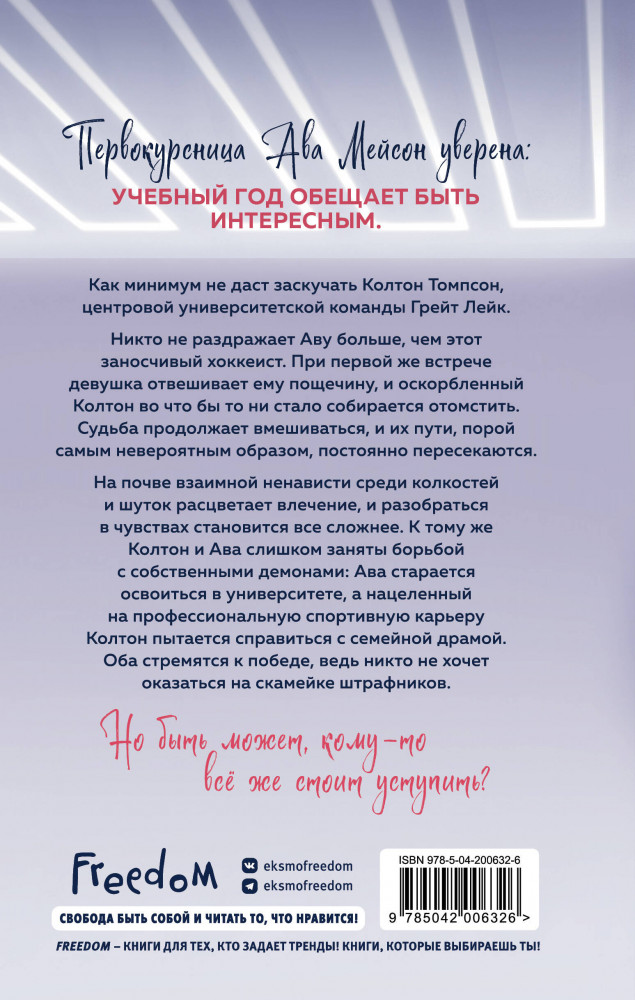 💳 Оплатить за товар можно при получении 🇰🇿 Есть бесплатная доставка по Казахстану от 1 дня 🎁 Копите бонусы с каждой покупки Серия: Freedom. Грешники на льду. Чувственные хоккейные романы Анастасии Уайт Первокурсница Ава Мейсон уверена: учебный год обещает быть интересным. Как минимум, не даст заскучать Колтон Томпсон, центровой университетской команды Грейт Лейк. Никто не раздражает Аву больше, чем этот заносчивый хоккеист. При первой же встрече девушка отвешивает ему пощечину, и оскорбленный Колтон во что бы то ни стало собирается отомстить. Судьба продолжает вмешиваться, и их пути, порой самым невероятным образом, постоянно пересекаются. На почве взаимной ненависти, среди колкостей и шуток расцветает влечение, и разобраться в чувствах становится все сложнее. К тому же, Колтон и Ава слишком заняты борьбой с собственными демонами: Ава старается освоиться в университете, а нацеленный на профессиональную спортивную карьеру Колтон пытается справиться с семейной драмой. Оба стремятся к победе, ведь никто не хочет оказаться на скамейке штрафников. Но быть может, кому-то все же стоит уступить? |