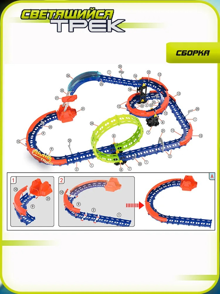 • светящийся автотрек: неоновая петля светятся в темноте, а машинка-перевертыш оставляет за собой световой шлейф на дороге, что делает гонки еще более эффектными и зрелищными;