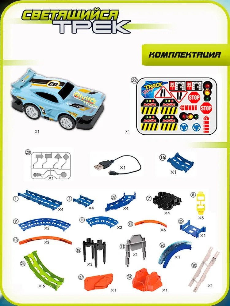 Комплектация: детали для сборки трека, 1 голубая машинка-перевертыш с подсветкой, USB-кабель, лист с наклейками, инструкция по сборке автотрека. Всего в наборе 53 элемента. |