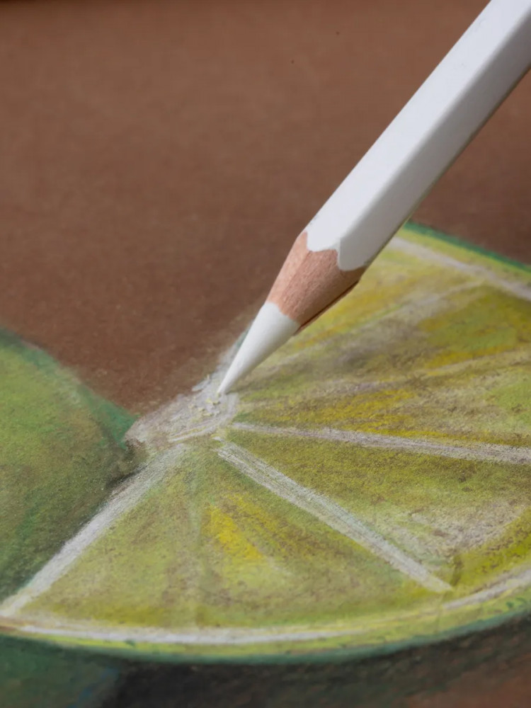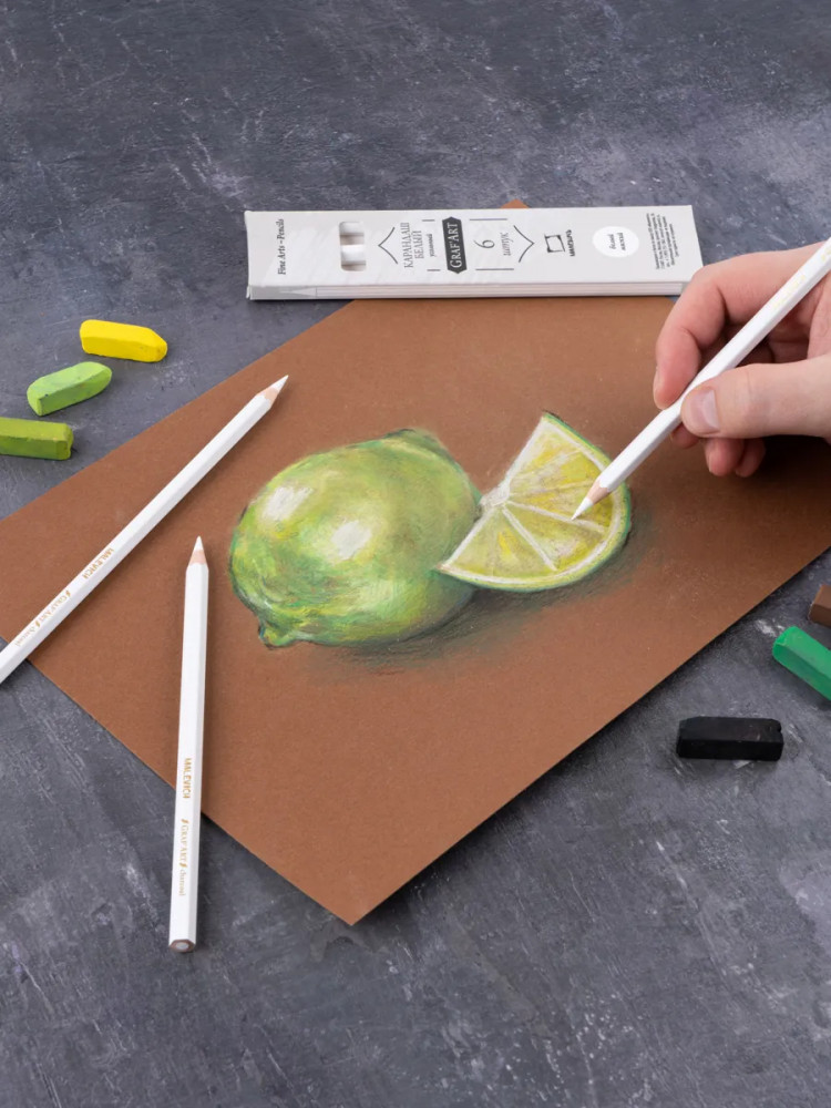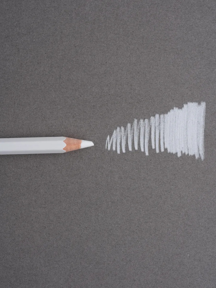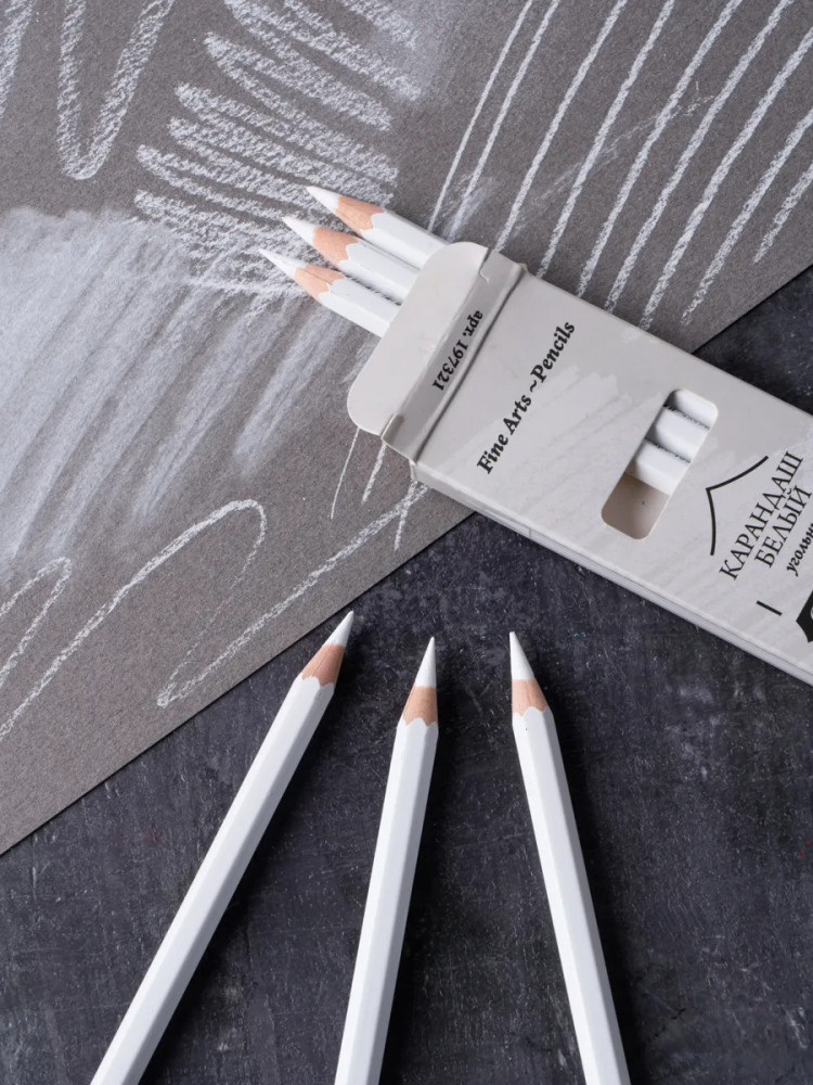 Художественные белые карандаши создают эффект, похожий на работу сухой кистью, позволяя добиться мягкой, размытой текстуры. Этот прием часто применяется для передачи воздушных перспектив и легких дымчатых эффектов. Как и другие виды сухих художественных материалов, этот карандаш требует фиксации, чтобы предотвратить смазывание и потерю яркости линий. Для этого можно использовать специальные фиксативы для пастели и угля, которые помогают закрепить рисунок на месте.
