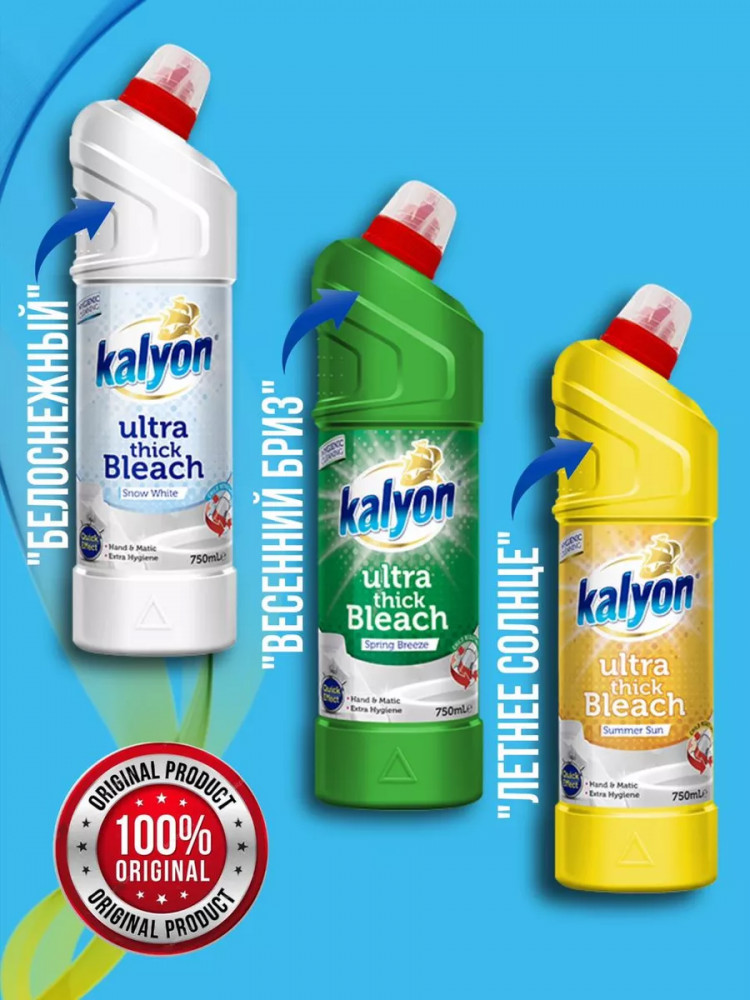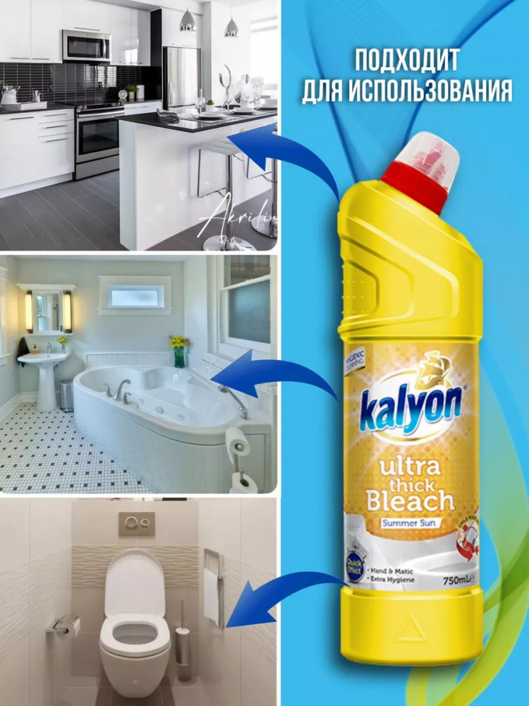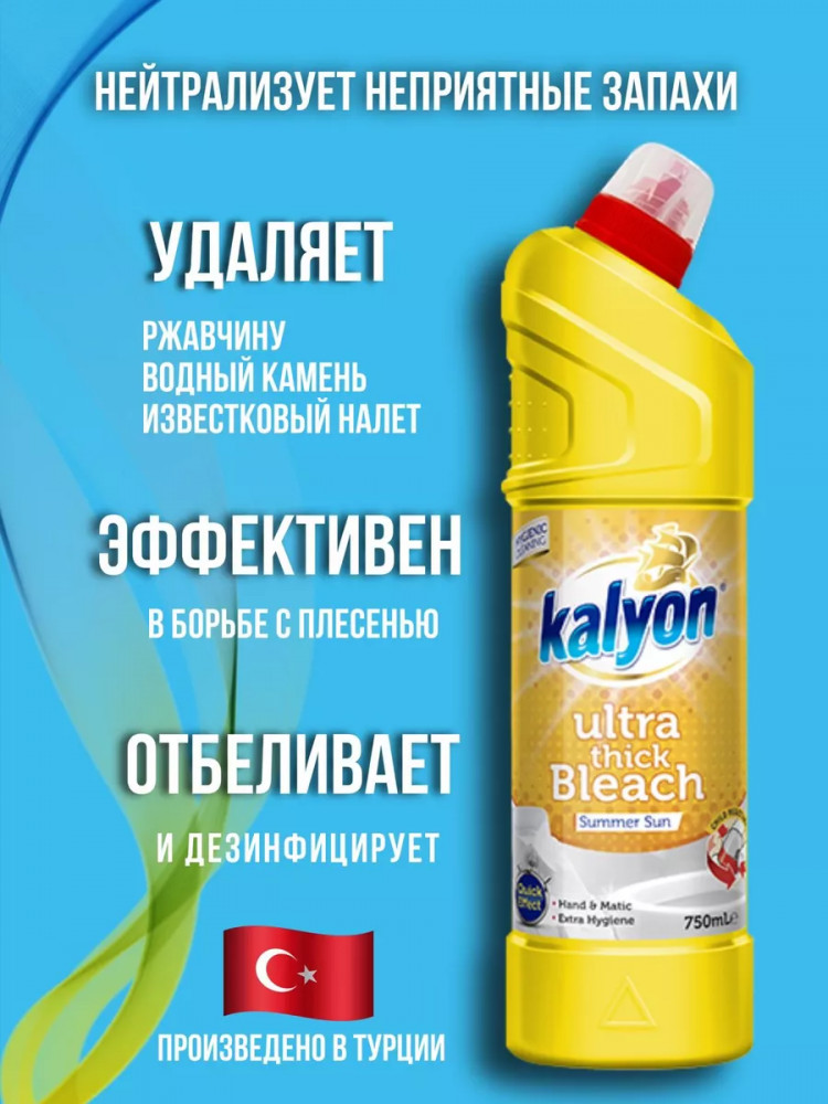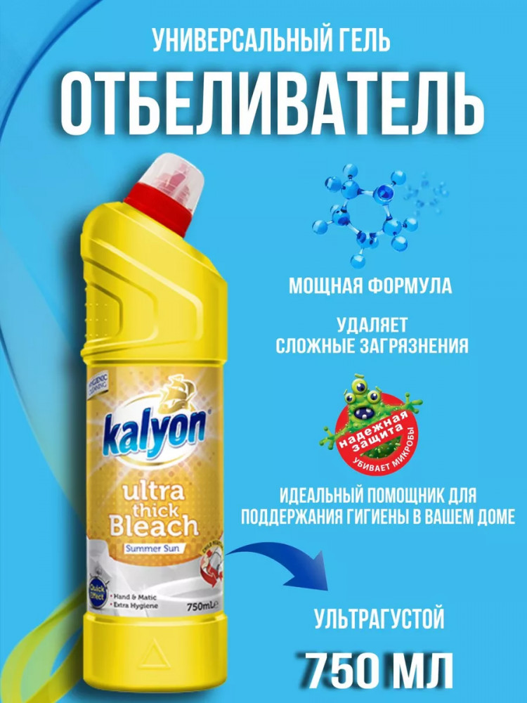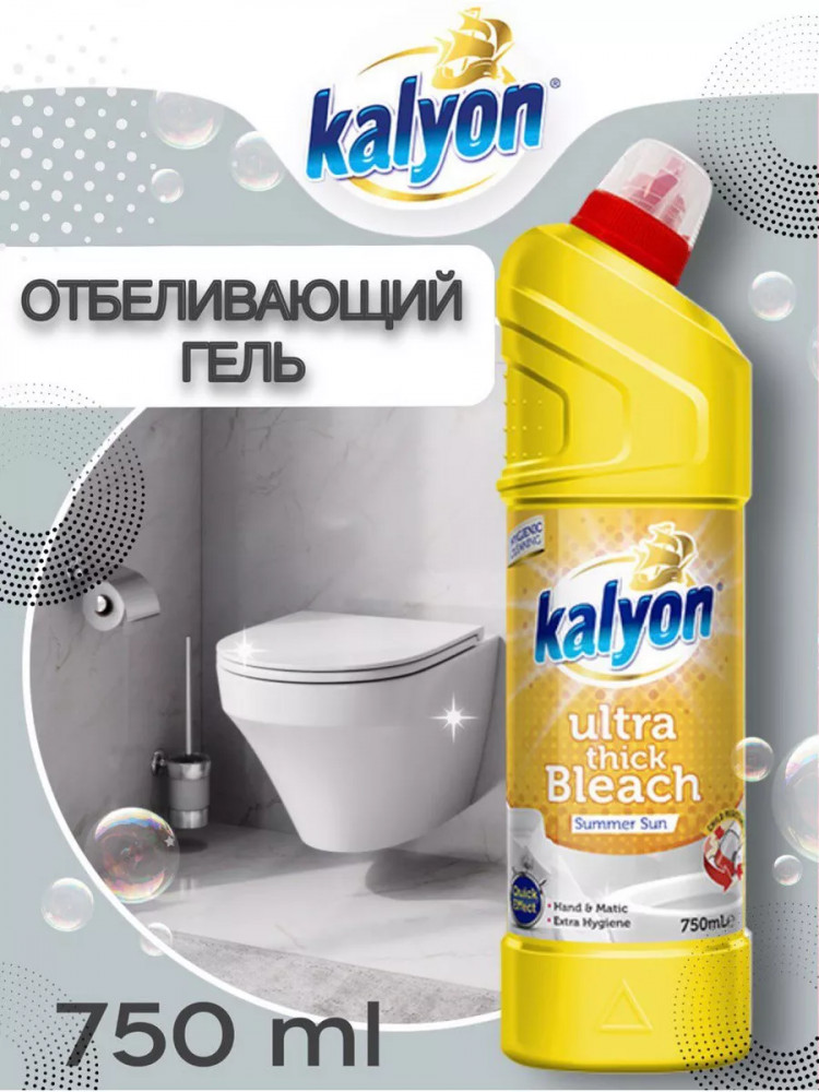 Ультрагустой отбеливатель Kalyon «Летнее солнце» — универсальное, мощное, дезинфицирующее и отбеливающее средство для туалетной и ванной комнаты, для кухни, для напольных и других поверхностей, а также для отбеливания белого белья. Моющее средство предназначено для чистки сантехнических изделий (ванн, раковин, унитазов) от ржавчины, известковых отложений, органических и жировых загрязнений. Средство для унитаза обеспечивает эффективную и постоянную гигиену и предотвращает появление неприятного запаха. Чистящий гель можно добавлять в сливные отверстия на кухне и в ванной комнате, а также добавлять как моющее средство в воду при мытье пола и кафеля для дезинфекции. Дезинфицирующее средство устраняет плесень, грибок, микробы, застаревшие пятна. Бытовая химия Калион — превосходно помогает с уходом, поддерживает чистоту и гигиену всего дома.