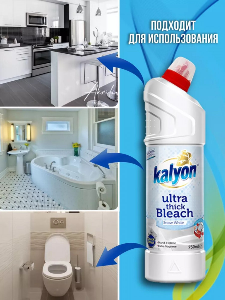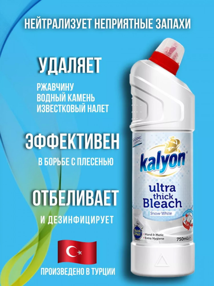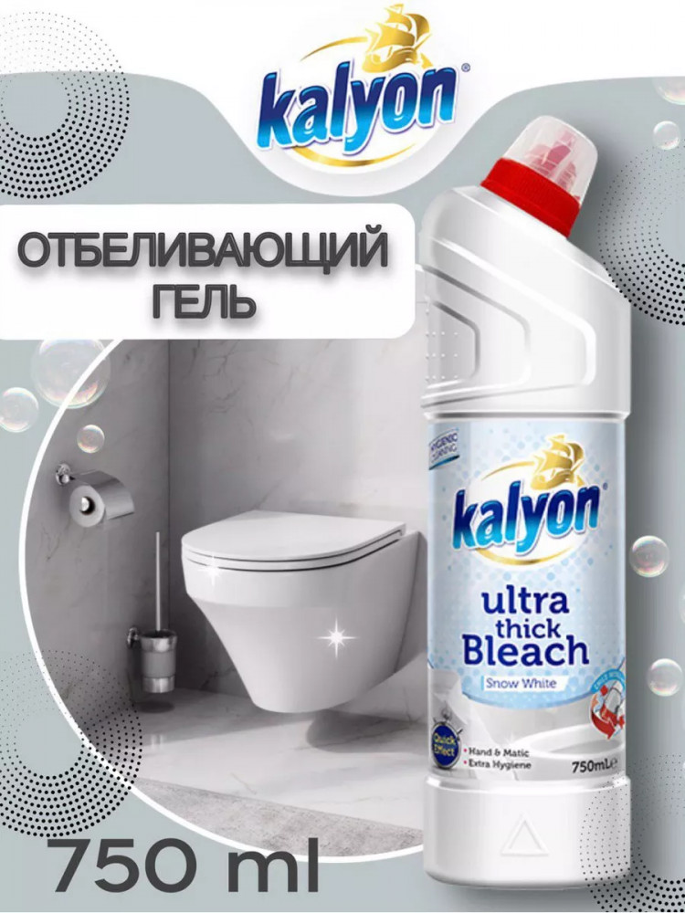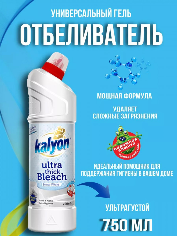 Ультрагустой отбеливатель Kalyon «Белоснежный» — универсальное, мощное, дезинфицирующее и отбеливающее средство для туалетной и ванной комнаты, для кухни, для напольных и других поверхностей, а также для отбеливания белого белья. Моющее средство предназначено для чистки сантехнических изделий (ванн, раковин, унитазов) от ржавчины, известковых отложений, органических и жировых загрязнений. Средство для унитаза обеспечивает эффективную и постоянную гигиену и предотвращает появление неприятного запаха. Чистящий гель можно добавлять в сливные отверстия на кухне и в ванной комнате, а также добавлять как моющее средство в воду при мытье пола и кафеля для дезинфекции. Дезинфицирующее средство устраняет плесень, грибок, микробы, застаревшие пятна. Бытовая химия Калион — превосходно помогает с уходом, поддерживает чистоту и гигиену всего дома.