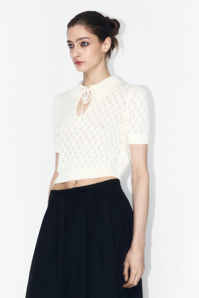 Короткий женский джемпер свободного кроя из легкой, дышащей ажурной ткани из 100% хлопка. Отложной рубашечный воротник c вырезом-капелькой на завязках. Короткие рукава с прямыми манжетами в рубчик и прямой линией плеча. Прямой нижний край в рубчик без разрезов и декоративных элементов. Соблазнительный полупрозрачный джемпер позволит создать образы в самых разных стилях. Сочетай его с классическим, повседневным, y2k или гранж-низом и создавай яркие, женственные и привлекательные аутфиты, с которыми ты точно не останешься незамеченной. Ажурный вязаный джемпер-поло отлично будет сочетаться с вещами из кожи или денима. Отличный вариант основы аутфитов на прогулки, вечеринки, концерты и просто на каждый день. Носи его отдельно или в составе многослойных образов в зависимости от твоего настроения.