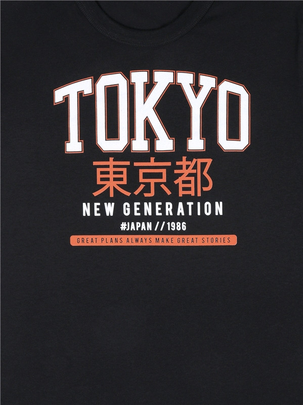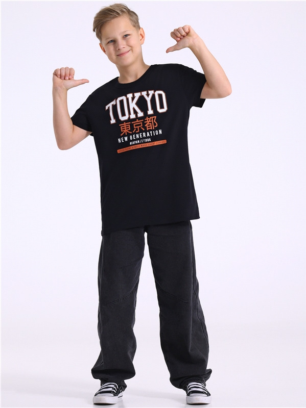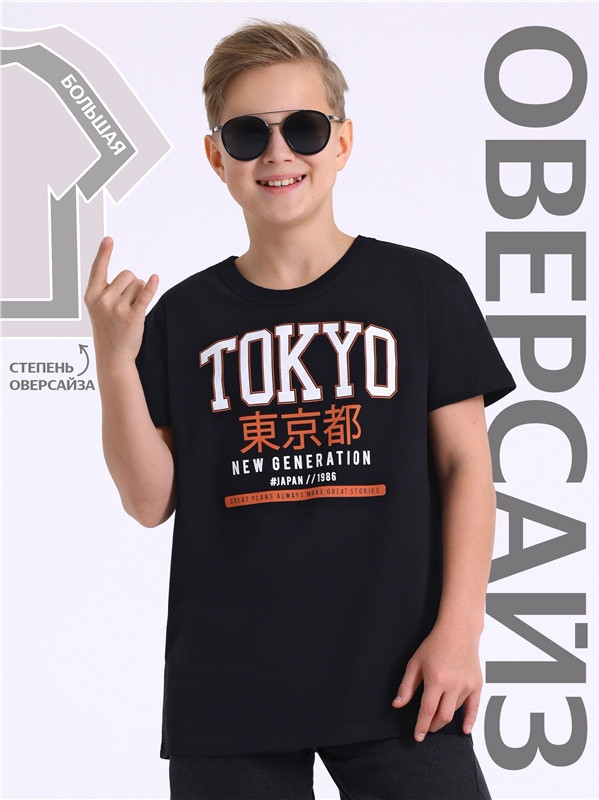 Оверсайз футболка для мальчика выполнена из кулира — легкого хлопкового полотна. Изделие прямого покроя с короткими рукавами и округлым вырезом горловины, украшено печатью.