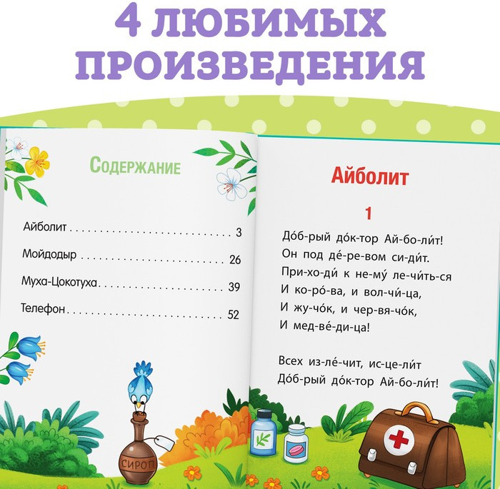 💳 Оплатить за товар можно при получении 🇰🇿 Есть бесплатная доставка по Казахстану от 1 дня 🎁 Копите бонусы с каждой покупки Книга содержит произведения Корнея Чуковского, на которых выросло не одно поколение малышей. Шрифт издания крупный, чтобы детям было удобно осваивать навыки чтения.Сказочные истории научат ребёнка доброте, справедливости, честности и расскажут, что нужно помогать другим.СодержаниеСказка – Айболит«Доктор Айболит» – это чудесная добрая история о том, как важно быть милосердным, чутким по отношению ко всем, кто попал в беду. Сказка учит взаимовыручке, сопереживанию, настойчивости в достижении цели.Сказка «Мойдодыр»Сказка учит быть чистоплотным, аккуратным, опрятным. Нужно самостоятельно следить за чистотой своего лица и тела, а также держать в чистоте личные вещи, не забывать наводить порядок в своей комнате.Сказка «Муха-Цокотуха»Чему учит сказка Муха-Цокотуха? Она осуждает чёрствость, фальшь, безразличие. Настоящие друзья так не поступают. В образе Комарика автор восхваляет отзывчивость, смелость, решительность, готов |