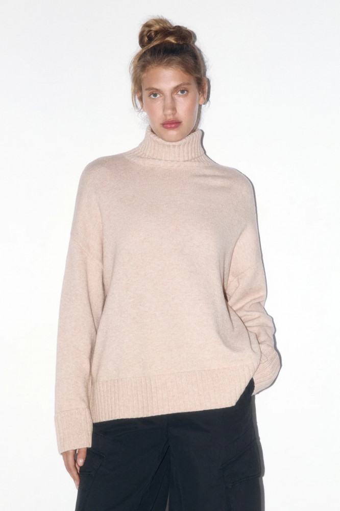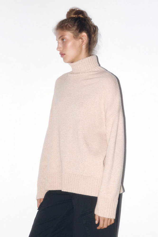 Теплый женский свитер свободного прямого кроя из мягкой и очень приятной к телу ткани плотной вязки на основе вискозы. Круглый вырез горловины с высоким воротником-стойкой в рубчик. Длинные свободные рукава с широкими эластичными манжетами в рубчик и спущенной линией плеча. Широкий нижний край в рубчик с декоративными разрезами по бокам. Различные однотонные расцветки в базовых оттенках для любого образа и настроения.