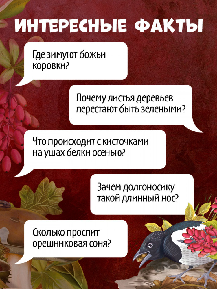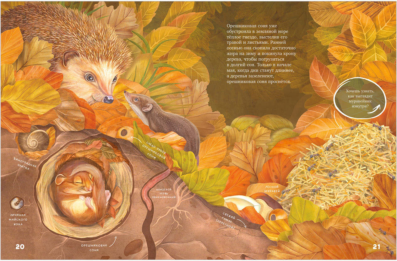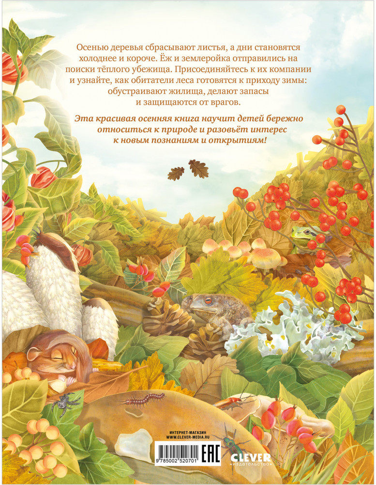 Секреты осеннего леса. Визуальная энциклопедияВ данный момент этот товар отсутствует в продаже. Возможно, у нас найдется аналогичный или похожий товар здесь. Серия: Удивительные энциклопедии Визуальная энциклопедия «Секреты осеннего леса» — красивая книга, которая научит детей бережно относиться к окружающему миру и разовьет интерес к новым знаниям и открытиям! Красочные разворотные иллюстрации захочется пересматривать, находя на них все новые и новые детали. Осенью деревья сбрасывают листья, а дни становятся холоднее и короче. Еж и землеройка отправились на поиски теплого убежища. Присоединяйтесь к их компании, открывайте визуальную энциклопедию «Секреты осеннего леса» и узнайте, как обитатели леса готовятся к приходу зимы: обустраивают жилища, делают запасы и защищаются от врагов. |