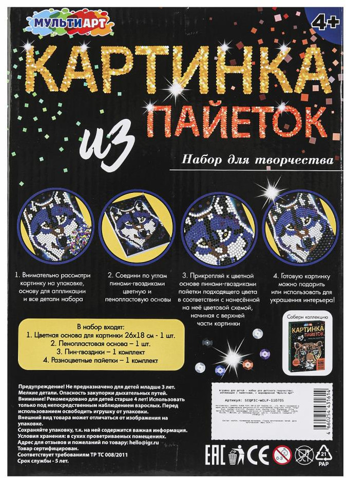 💳 Оплатить за товар можно при получении 🇰🇿 Есть бесплатная доставка по Казахстану от 1 дня 🎁 Копите бонусы с каждой покупки Набор для творчества — картина из пайеток «Волк» ТМ «Мульти Арт» — отличный подарок для маленького художника. С помощью красочной основы и сверкающих пайеток, прикрепляемых к ней гвоздиками, ребёнок сможет самостоятельно создать красивую блестящую картину с изображением грозного волка. Готовую поделку можно подарить близким или использовать для украшения интерьера. Занятия с наборами для творчества ТМ «Мульти Арт» развивают: внимание, усидчивость, творческое мышление, воображение, сенсорное и цветовое восприятие, моторику рук и воображение. |