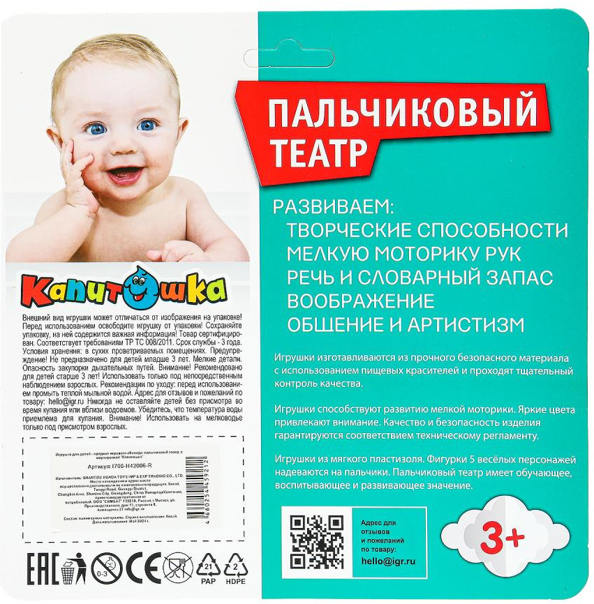 💳 Оплатить за товар можно при получении 🇰🇿 Есть бесплатная доставка по Казахстану от 1 дня 🎁 Копите бонусы с каждой покупки Игрушка из пластизоля для ванны — пальчиковый театр «Животные» ТМ «Капитошка» обязательно понравится малышу и сделает купание ещё более весёлым. Ребёнок с удовольствием будет играть с яркими фигурками животных и устраивать с ними пальчиковые театральные представления. Родители также могут принимать активное участие в таких постановках — фигурки подходят как для детских, так и для взрослых пальцев. Красочная расцветка и детальная проработка фигурок привлекут внимание малыша и сделают игру весёлой и интересной. Игры в пальчиковый театр ТМ «Капитошка» развивают: творческие способности, воображение, внимание, мелкую моторику рук, общение, артистизм, речь и словарный запас. |