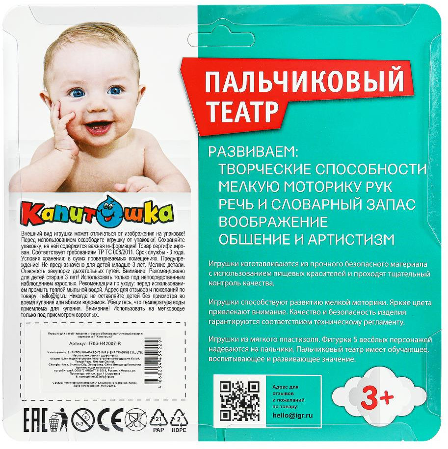 💳 Оплатить за товар можно при получении 🇰🇿 Есть бесплатная доставка по Казахстану от 1 дня 🎁 Копите бонусы с каждой покупки Игрушка из пластизоля для ванны — пальчиковый театр «Животные» ТМ «Капитошка» обязательно понравится малышу и сделает купание ещё более весёлым. Ребёнок с удовольствием будет играть с яркими фигурками животных и устраивать с ними пальчиковые театральные представления. Родители также могут принимать активное участие в таких постановках — фигурки подходят как для детских, так и для взрослых пальцев. Красочная расцветка и детальная проработка фигурок привлекут внимание малыша и сделают игру весёлой и интересной. Игры в пальчиковый театр ТМ «Капитошка» развивают: творческие способности, воображение, внимание, мелкую моторику рук, общение, артистизм, речь и словарный запас. |