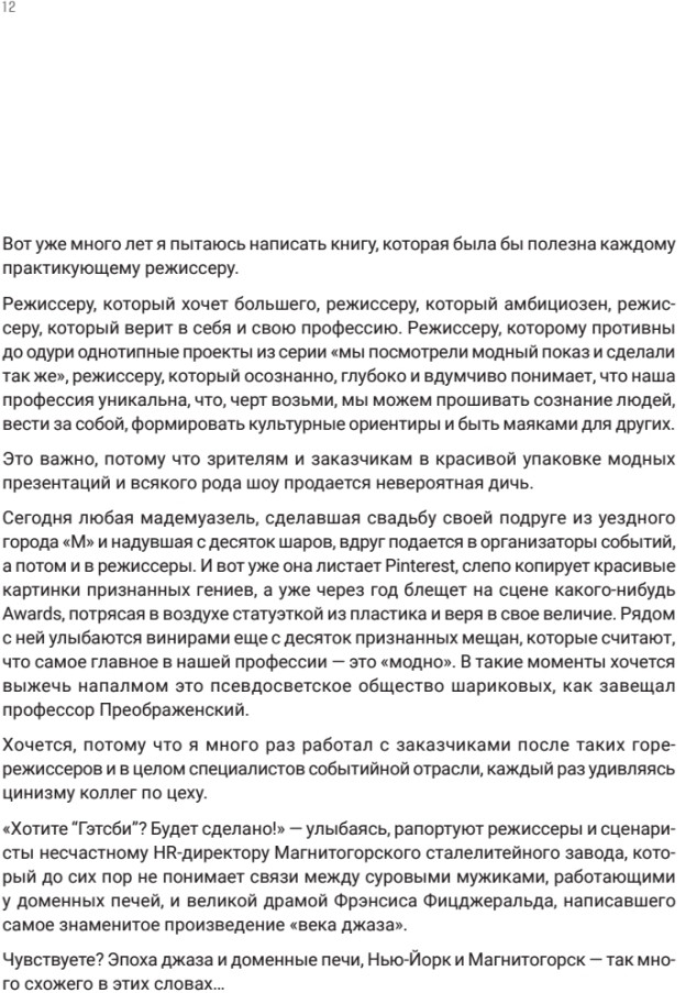 💳 Оплатить за товар можно при получении 🇰🇿 Есть бесплатная доставка по Казахстану от 1 дня 🎁 Копите бонусы с каждой покупки Книга о режиссуре и event индустрии, написанная для тех, кто хочет создавать проекты, меняющие жизнь людей и компаний. Вахтанг Вахтангишвили — режиссер и креативный директор агентства V-EVENTS — вот уже 20 лет практикует ежемесячную постановочную работу для самых статусных и значимых событий в стране и мире. Автор делится важными знаниями для event-режиссеров и режиссеров шоу, которые действительно будут необходимы при создании незабываемых проектов. Вы узнаете, из каких этапов и нюансов выстраивается работа режиссера и режиссерско-постановочной группы. А также поймете, на что следует обратить внимание в первую очередь при подготовке мероприятия. Книга адресована амбициозным и целеустремленным event-режиссерам, любящим свою профессию, а также студентам по направлению обучения «Режиссура театрализованных представлений и праздников». |