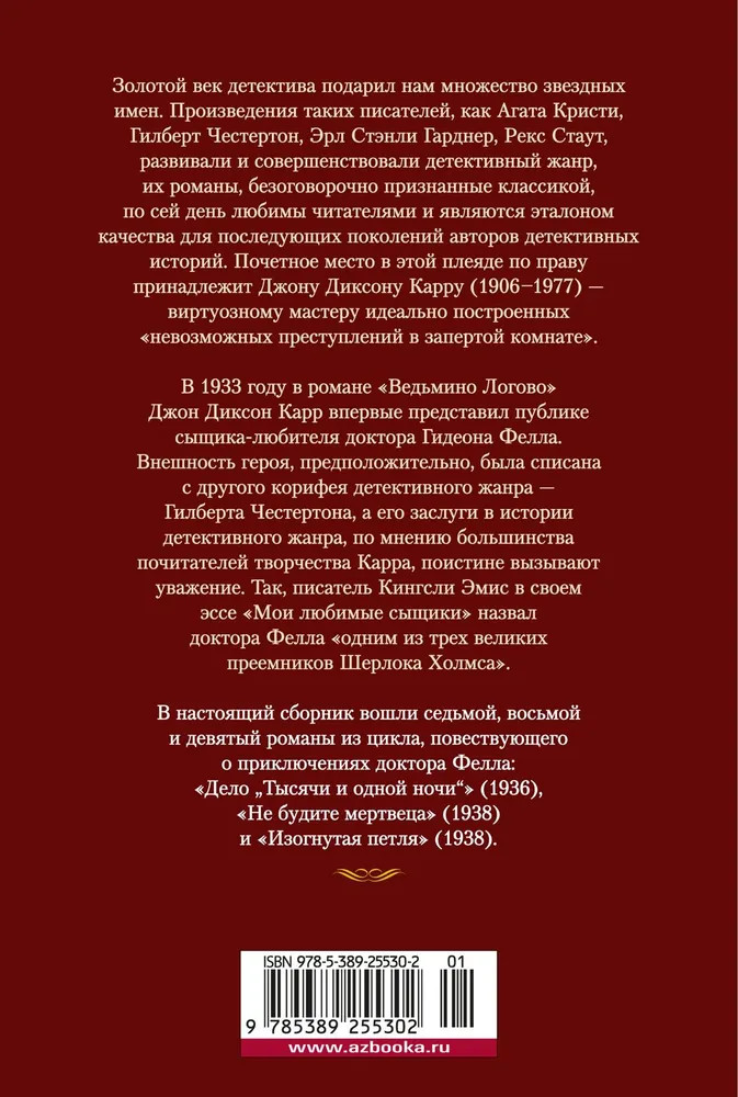 💳 Оплатить за товар можно при получении 🇰🇿 Есть бесплатная доставка по Казахстану от 1 дня 🎁 Копите бонусы с каждой покупки Серия: Иностранная литература. Классика детектива Золотой век детектива подарил нам множество звездных имен. Произведения таких писателей, как Агата Кристи, Гилберт Честертон, Эрл Стэнли Гарднер, Рекс Стаут, развивали и совершенствовали детективный жанр, их романы, безоговорочно признанные классикой, по сей день любимы читателями и являются эталоном качества для последующих поколений авторов детективных историй. Почетное место в этой плеяде по праву принадлежит Джону Диксону Карру (1906–1977) — виртуозному мастеру идеально построенных «невозможных преступлений в запертой комнате». В 1933 году в романе «Ведьмино Логово» Джон Диксон Карр впервые представил публике сыщика-любителя доктора Гидеона Фелла. Внешность героя, предположительно, была списана с другого корифея детективного жанра — Гилберта Честертона, а его заслуги в истории детективного жанра, по мнению большинства почитателей творчества Карра, поистине вызывают уважение. Так, писатель Кингсли Эмис в своем эссе «Мои любимые сыщики» назвал доктора Фелла «одним из трех великих преемников Шерлока Холмса». |