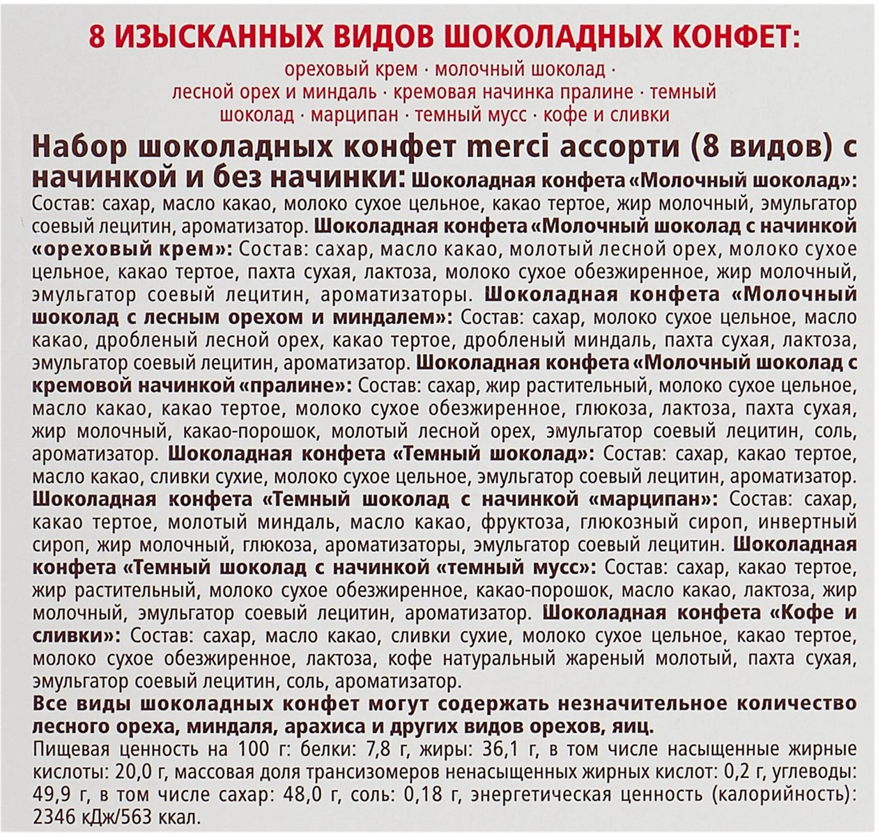 Конфеты шоколадные «Молочный шоколад с лесным орехом и миндалем»: сахар, молоко сухое цельное, масло какао, дробленый лесной орех, какао тертое, дробленый миндаль, пахта сухая, лактоза, эмульгатор соевый лецитин, ароматизатор.