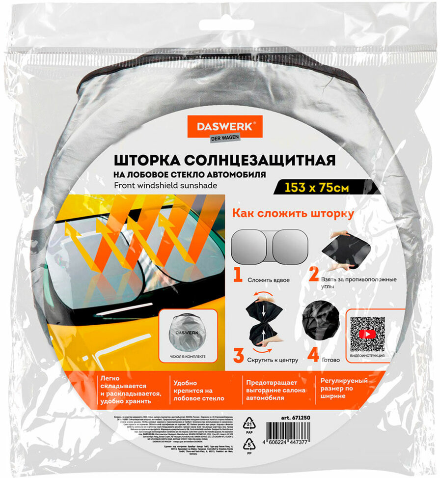 💳 Оплатить за товар можно при получении 🇰🇿 Есть бесплатная доставка по Казахстану от 1 дня 🎁 Копите бонусы с каждой покупки Солнцезащитная шторка DASWERK необходима для блокировки попадания солнечных лучей в салон автомобиля. Серебристая поверхность шторки отражает солнечные лучи, препятствует нагреванию салона, защищает салон и торпеду от выгорания. Чтобы установить солнцезащитную шторку, необходимо ее полностью развернуть, нижнюю часть закрепить на панели, а верхнюю часть прижать козырьками. Благодаря упругому каркасу по периметру шторка надежно фиксируется на лобовом стекле автомобиля и не сползает. Размеры: ширина — 153 см, высота — 75 см. Обладает дополнительной функцией уменьшения ширины на 10 см. |