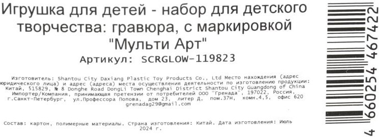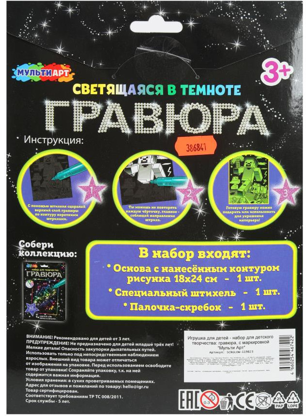 С помощью данного набора юный художник сможет создать эффектную картину на чёрном фоне, которая загадочно светится в темноте. Контур рисунка уже нанесён на основу, остаётся только процарапать изображение специальным штихелем. Можно не повторять каждую черточку, главное — соблюдать направление штриха! Готовая поделка станет отличным вариантом для подарка близким или для украшения интерьера комнаты.