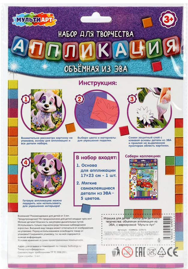 💳 Оплатить за товар можно при получении 🇰🇿 Есть бесплатная доставка по Казахстану от 1 дня 🎁 Копите бонусы с каждой покупки Набор для творчества — объёмная аппликация из ЭВА «Щенок» ТМ «Мульти Арт» — отличный подарок для ребёнка, который будет способствовать развитию его творческих способностей. |