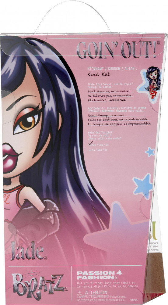 Устройте самую незабываемую вылазку в город вместе с Джейд! В игровом наборе Братц Джейд Goin Out! кукла высотой 25 см с подвижными ручками и ножками и с длинными прошитыми волосами, съемный наряд, обувь, очки солнцезащитные, сумка, расческа. Игрушка изготовлена из полимерных и текстильных материалов. Товар сертифицирован и безопасен для детского использования. Упаковка: трапециевидная упаковка (18×7×30 см).