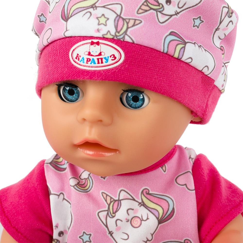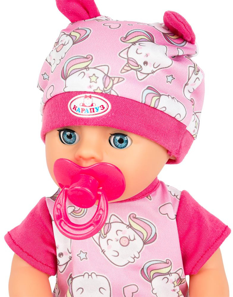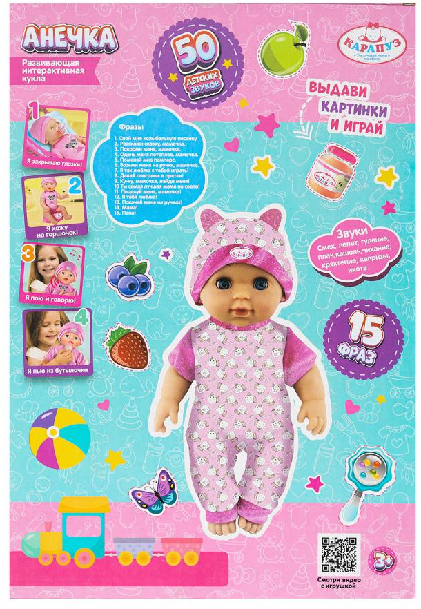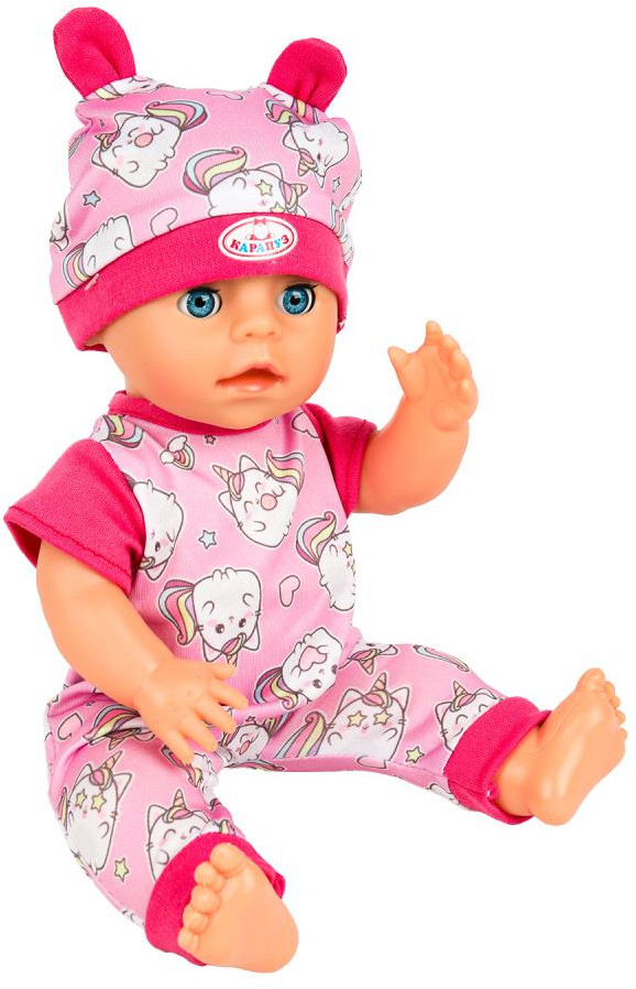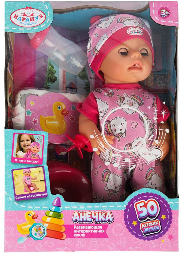 В данный момент этот товар отсутствует в продаже. Возможно, у нас найдется аналогичный или похожий товар здесь. Интерактивный пупс «Анечка» ТМ «Карапуз» станет замечательным подарком для вашей принцессы. Милый пупс Анечка с детально проработанным личиком обязательно понравится вашей малышке. Кукла одета в яркий костюмчик с милым принтом в виде котиков-единорогов и шапочку в тон. Одежда легко надевается и снимается. Для более интересной игры в комплекте с пупсом идут разнообразные аксессуары.