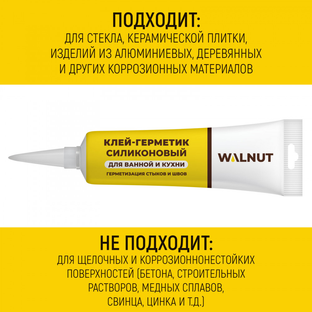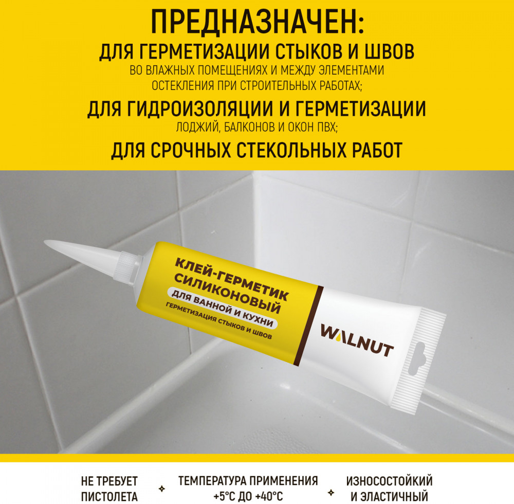 Силиконовый санитарный герметик — идеальное решение для герметизации швов и стыков в помещениях с повышенной влажностью, таких как ванная комната и кухня. Он также подходит для заполнения швов между стеновыми ПВХ панелями, кухонного фартука, керамической плиткой и выполнения стекольных работ. Строительный материал совместим с различными поверхностями, включая самоклеящиеся покрытия, керамогранит, стекло, дерево и другими. Состав устойчив к широкому диапазону температур — от −40 до 100 градусов Цельсия, что делает его незаменимым в уплотнении пластиковых окон и стен, но также применяют при ремонте мебели и выполнении декоративных работ. Благодаря удобной упаковке, использование монтажного пистолета не требуется, что упрощает процесс нанесения уплотнителя. В ассортименте Walnut представлен широкий выбор данного товара. Можно подобрать продукт в зависимости от потребностей.