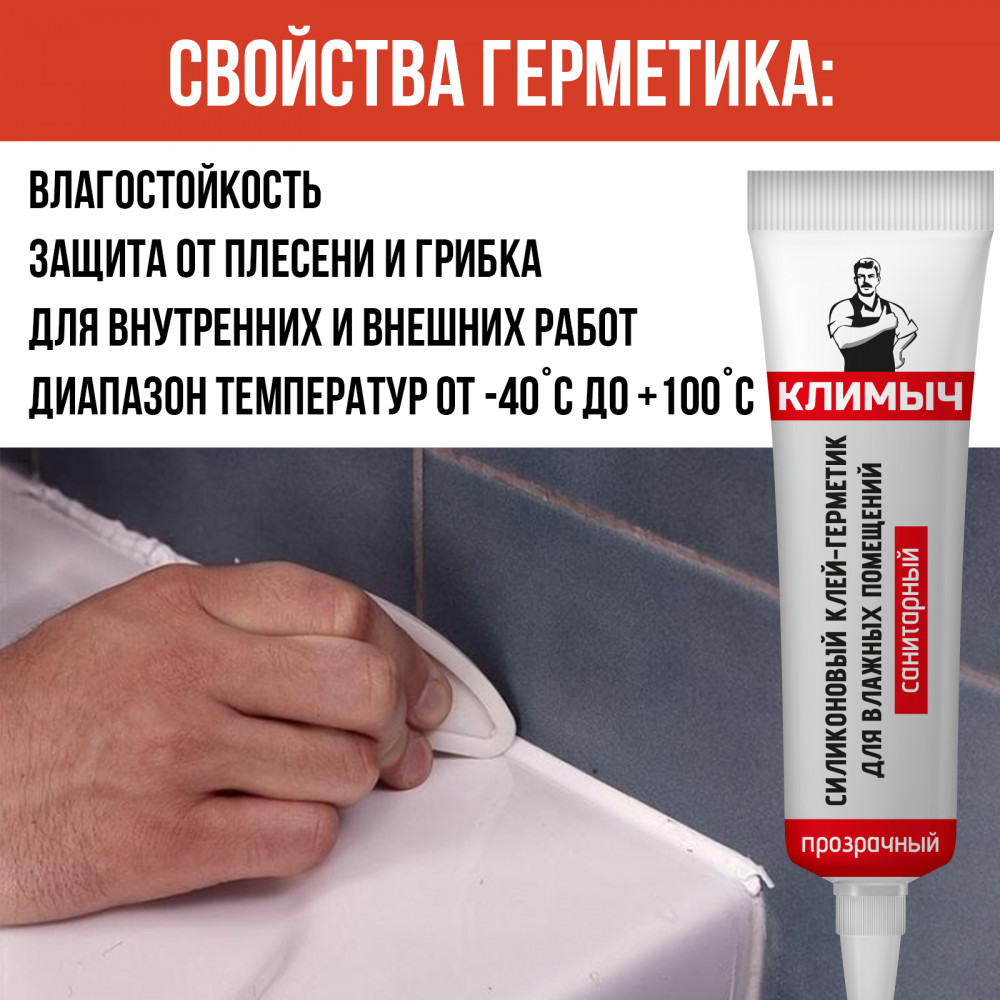 В составе санитарного герметика фунгицидные ацетатные добавки, что обеспечивает высокую защиту покрытий к образованию плесени и грибка в стыках стен и сантехники. Профессиональный строительный материал — идеальный продукт для ручной обработки каждого уголка квартиры, подходит для заделки швов между кафелем, заполнения трещин, а также при установке стекол, зеркал или стеклянных полок. Однако стоит учесть, что данное средство не рекомендуется использовать на для щелочных и коррозионных поверхностях: бетон и строительные растворы, медь и ее сплавы, цинк, свинец, так как это может негативно сказаться на его адгезии и сроке службы.