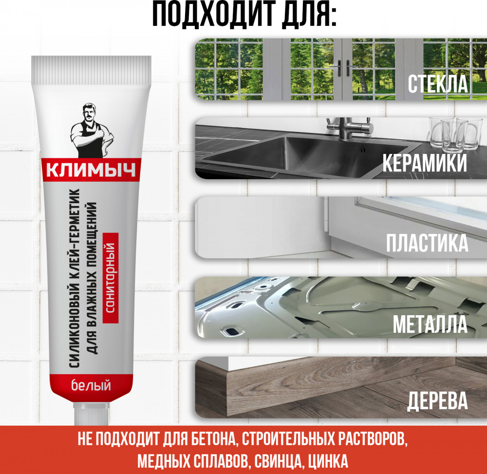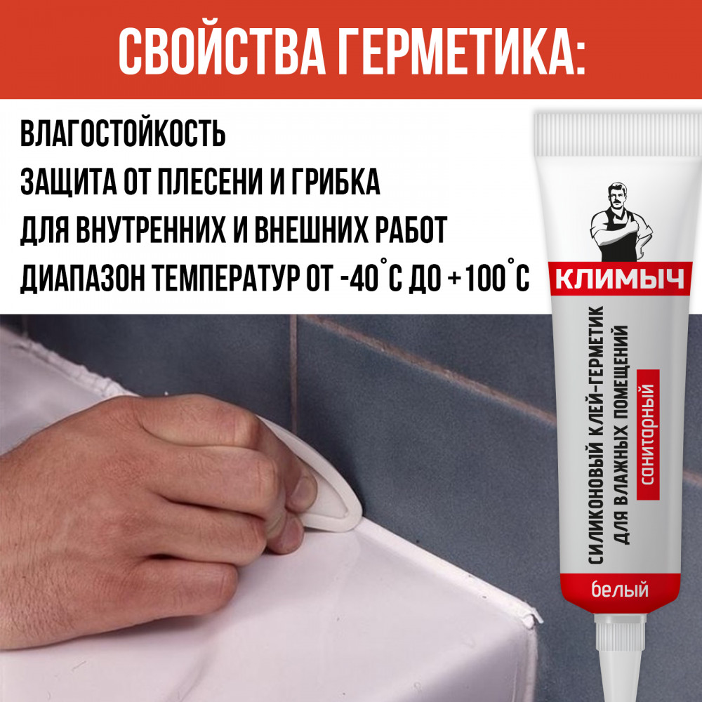 В составе санитарного герметика фунгицидные ацетатные добавки, что обеспечивает высокую защиту покрытий к образованию плесени и грибка в стыках стен и сантехники. Профессиональный строительный материал — идеальный продукт для ручной обработки каждого уголка квартиры, подходит для заделки швов между кафелем, заполнения трещин, а также при установке стекол, зеркал или стеклянных полок. Однако стоит учесть, что данное средство не рекомендуется использовать на для щелочных и коррозионных поверхностях: бетон и строительные растворы, медь и ее сплавы, цинк, свинец, так как это может негативно сказаться на его адгезии и сроке службы.
