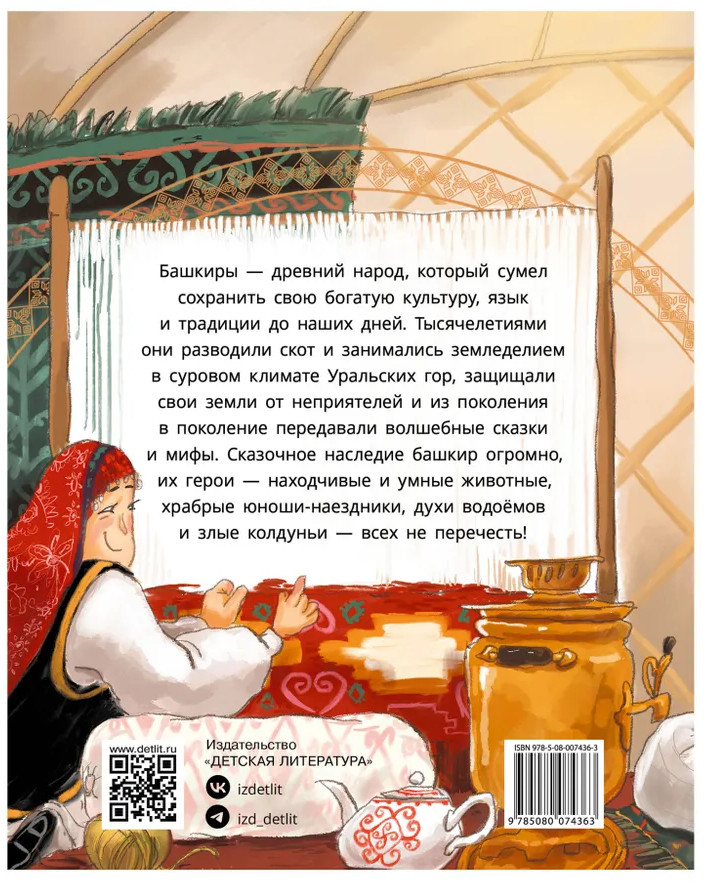 💳 Оплатить за товар можно при получении 🇰🇿 Есть бесплатная доставка по Казахстану от 1 дня 🎁 Копите бонусы с каждой покупки Серия: Дом сказок Татары — древний народ с тысячелетней историей. Их культурное наследие богато и огромно, и старинные волшебные сказки — его неотъемлемая часть. В татарских сказках находчивые животные приходят на помощь людям с добрым сердцем, смекалка и ум всегда на шаг впереди хитрости и жадности, и конечно, в сказках воспеваются настоящая дружба, сердечное гостеприимство и уважение к старшим. |