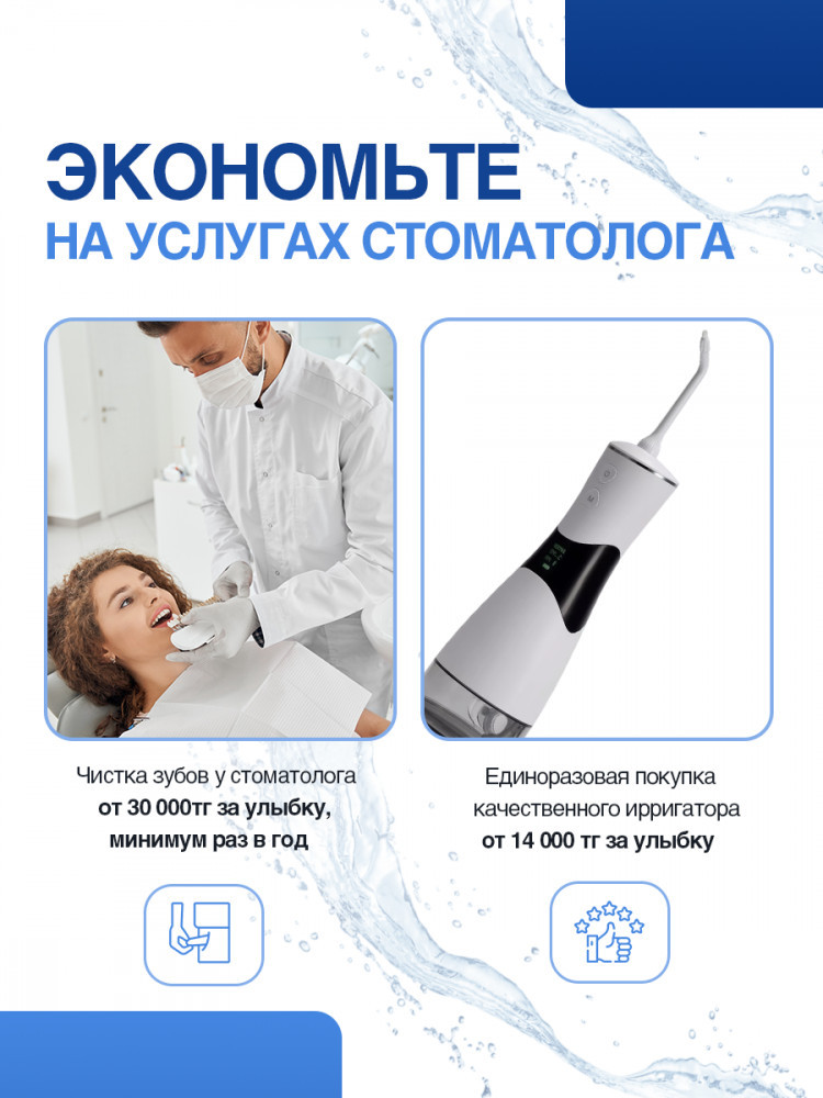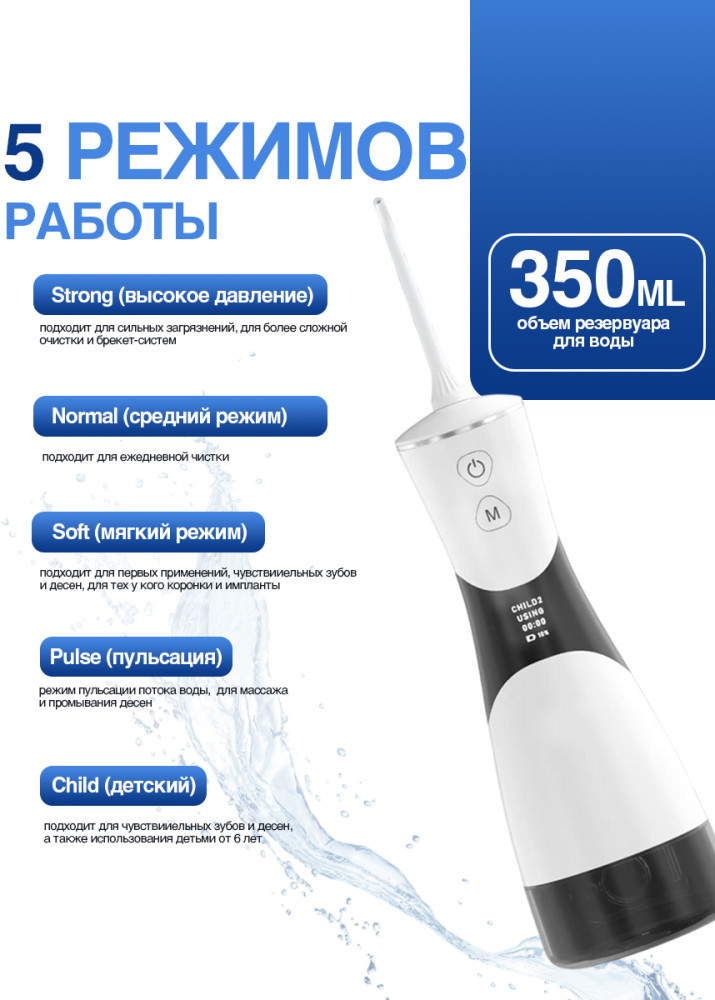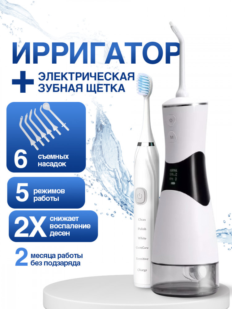 Портативный ирригатор с электрической зубной щеткойВ данный момент этот товар отсутствует в продаже. Возможно, у нас найдется аналогичный или похожий товар здесь. Портативный ирригатор обладает компактными размерами и работает от аккумулятора, что с легкостью позволяет взять его с собой в дорогу. Ирригатор заряжается от любого устройства с USB зарядкой. Встроенный аккумулятор емкостью 1800 мАч. Время работы на одном заряде 2 часа. Сигналы-индикаторы на корпусе прибора сообщают о состоянии батареи ирригатора. Аккумулятор 1800 мА/ч. Объем резервуара составляет 350 мл. Частота пульсации 6950-8000 раз/мин. Давление воды 30-150 PSI. В комплект входит: ирригатор, 6 съемных насадок, USB кабель. Мощность 3Вт. Благодаря эргономичному корпусу ирригатор удобно лежит в руке. |