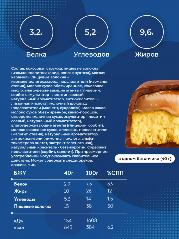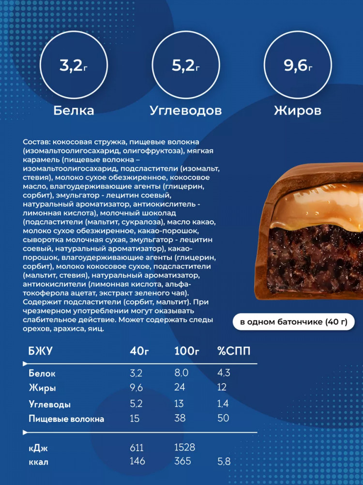 Со вкусом брауни: кокосовая стружка, пищевые волокна (изомальтоолигосахарид, олигофруктоза), мягкая карамель (пищевые волокна — изомальтоолигосахарид, подсластители (изомальт, стевия), молоко сухое обезжиренное, кокосовое масло, влагоудерживающие агенты (глицерин, сорбит), эмульгатор — лецитин соевый, натуральный ароматизатор, антиокислитель — лимонная кислота), молочный шоколад (подсластители (мальтит, сукралоза), масло какао, молоко сухое обезжиренное, какао-порошок, сыворотка молочная сухая, эмульгатор — лецитин соевый, натуральный ароматизатор), какао-порошок, влагоудерживающие агенты (глицерин, сорбит), молоко кокосовое сухое, подсластители (мальтит, стевия), натуральный ароматизатор, антиокислители (лимонная кислота, альфа-токоферола ацетат, экстракт зеленого чая). Содержит подсластители (сорбит, мальтит). При чрезмерном употреблении могут оказывать слабительное действие. Может содержать следы орехов, арахиса, яиц.