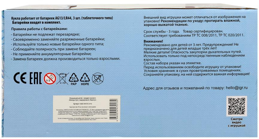Внимание! Работает от 3 батареек типа LR44 (в комплекте). |