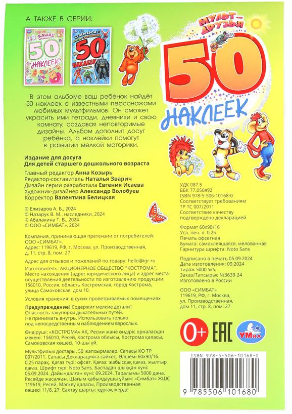💳 Оплатить за товар можно при получении 🇰🇿 Есть бесплатная доставка по Казахстану от 1 дня 🎁 Копите бонусы с каждой покупки Серия: 50 наклеек Альбом наклеек «Мульт-друзья» из серии «50 наклеек» ТМ «УМка» непременно понравится маленькому поклоннику мультфильмов студии «Экран». Наклейки с известными мультгероями и разнообразными милыми картинками можно использовать для украшения альбомов, тетрадей, блокнотов или создания на бумаге удивительных историй с участием персонажей этой активити. Благодаря компактному формату альбом удобно брать с собой в дорогу. |