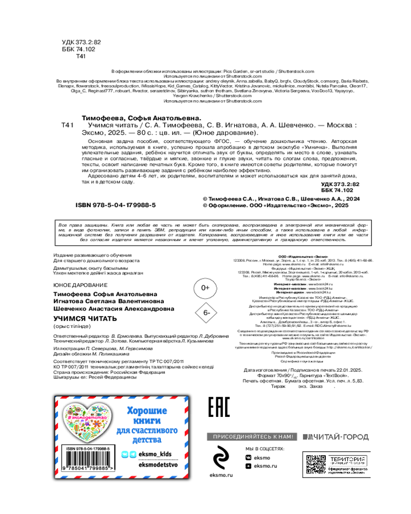 💳 Оплатить за товар можно при получении 🇰🇿 Есть бесплатная доставка по Казахстану от 1 дня 🎁 Копите бонусы с каждой покупки Серия: Юное дарование Цель книги — сформировать у ребенка навык чтения. В пособии, соответствующем ФГОС, использована авторская методика, апробированная в детском эко-клубе «Умничка» и нашедшая своих поклонников среди родителей. Для того, чтобы процесс обучения чтению был наиболее эффективным, предлагается последовательно пройти несколько этапов: развитие фонематического слуха, знакомство со слогом, чтение слов, предложений, связных текстов и ответы на вопросы по их содержанию, написание печатных букв. |