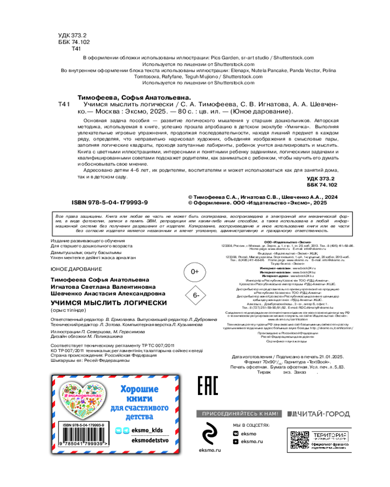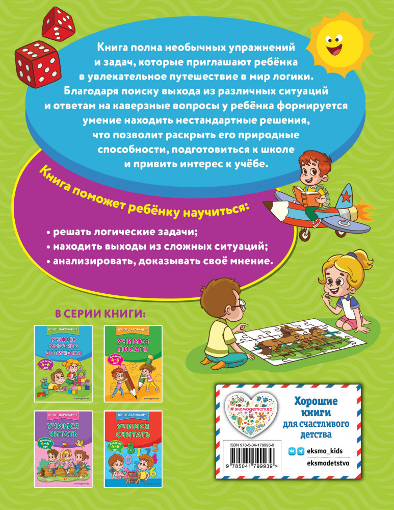 💳 Оплатить за товар можно при получении 🇰🇿 Есть бесплатная доставка по Казахстану от 1 дня 🎁 Копите бонусы с каждой покупки Серия: Юное дарование Цель пособия — научить дошкольника мыслить логически. В книге по подготовке к школе ребенок найдет увлекательные, нестандартные, развивающие задания, способствующие тренировке навыка решения логических задач. Он научится классифицировать, сравнивать, продолжать последовательности, определять закономерности, причинно-следственные связи. Цветные иллюстрации сделают процесс обучения простым и понятным. Каждое задание направлено на то, чтобы дети могли самостоятельно анализировать, размышлять, делать выводы, принимать решения. Кроме того, перед разделами имеются советы родителям, которые помогут родителям максимально эффективно организовать развивающие занятия с ребенком. Книга издательства «Эксмо» поможет раскрыть природные способности ребенка, подготовить его к школе без помощи специалистов, заложить крепкий фундамент для дальнейшего успешного обучения. |