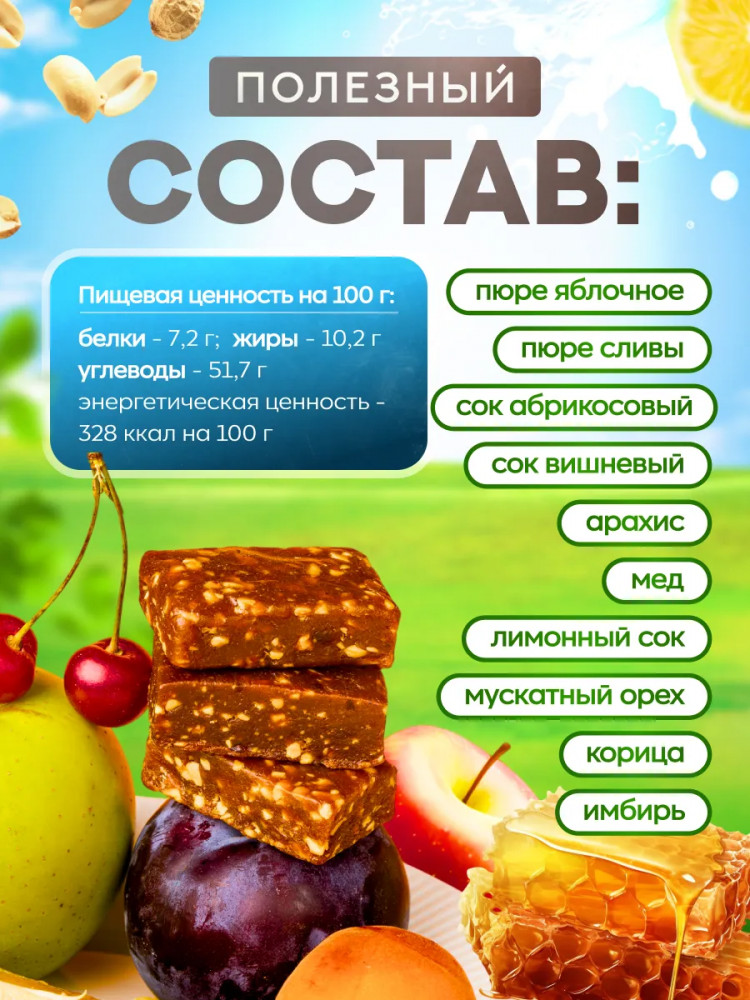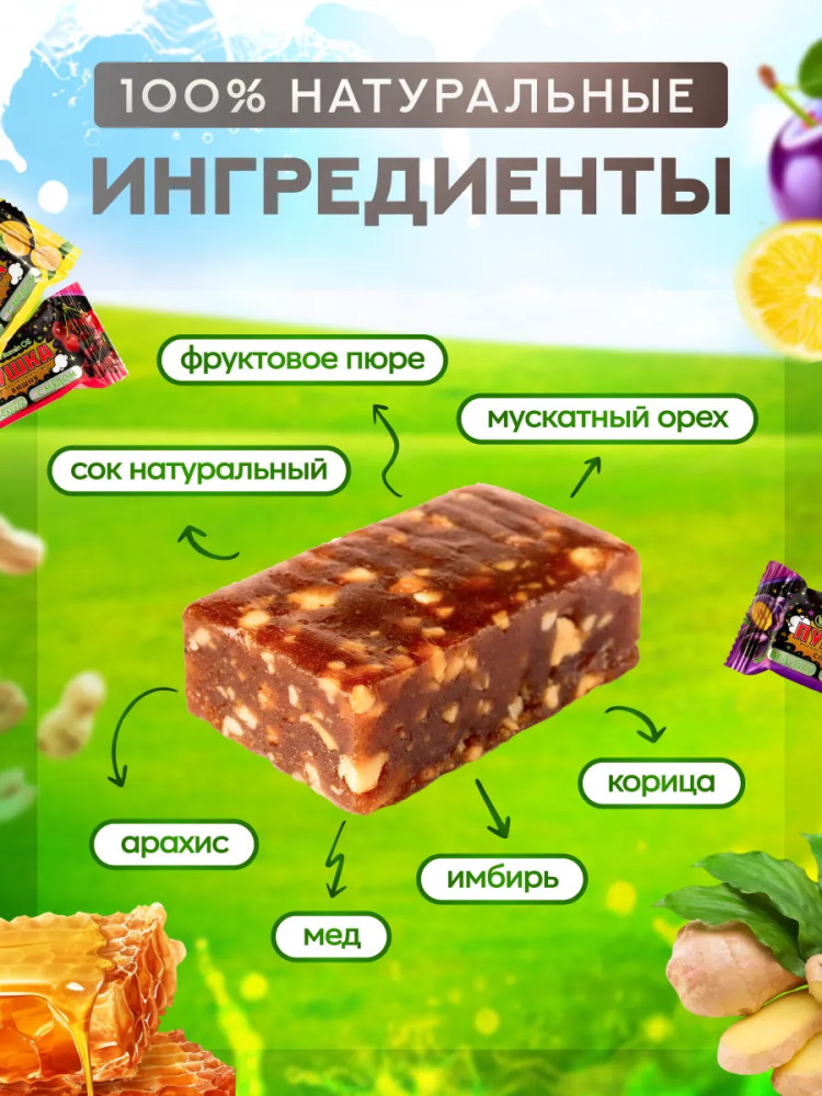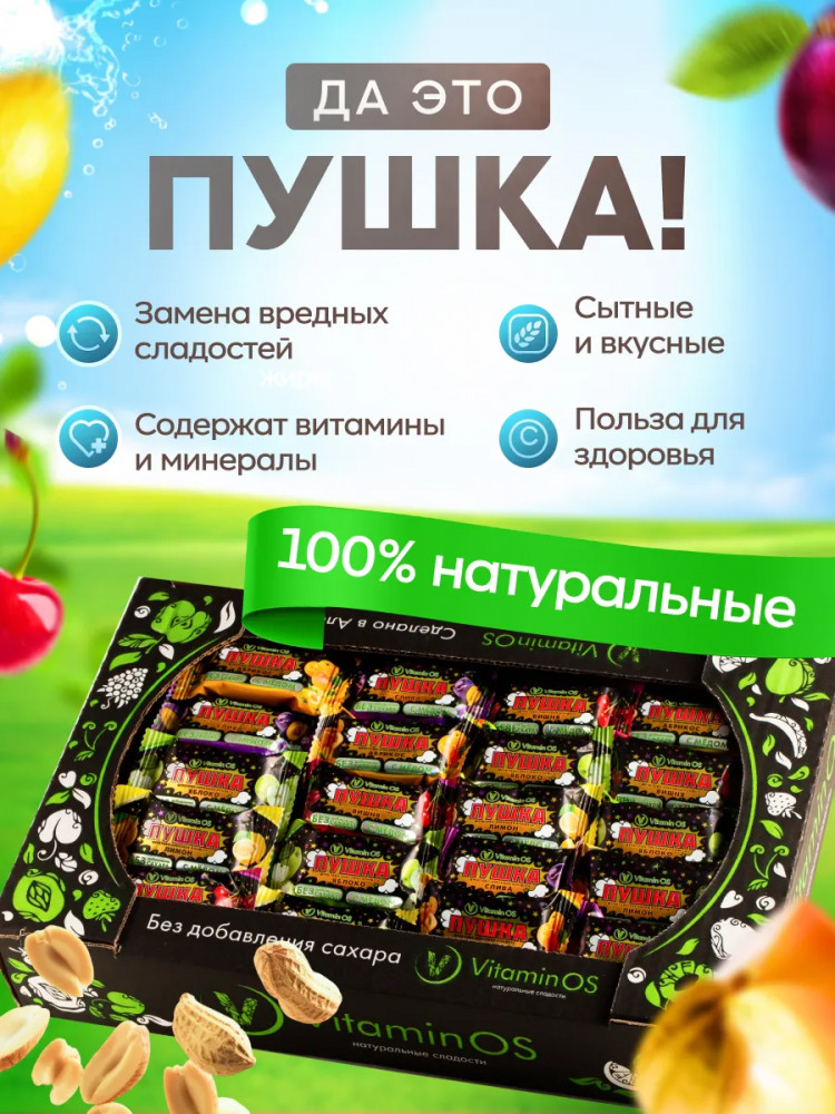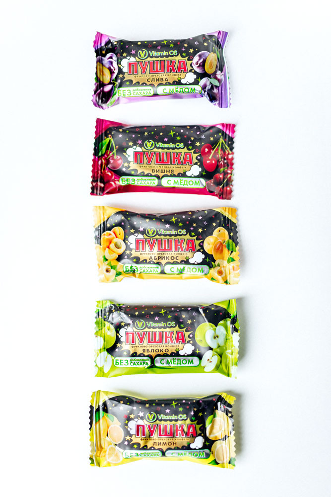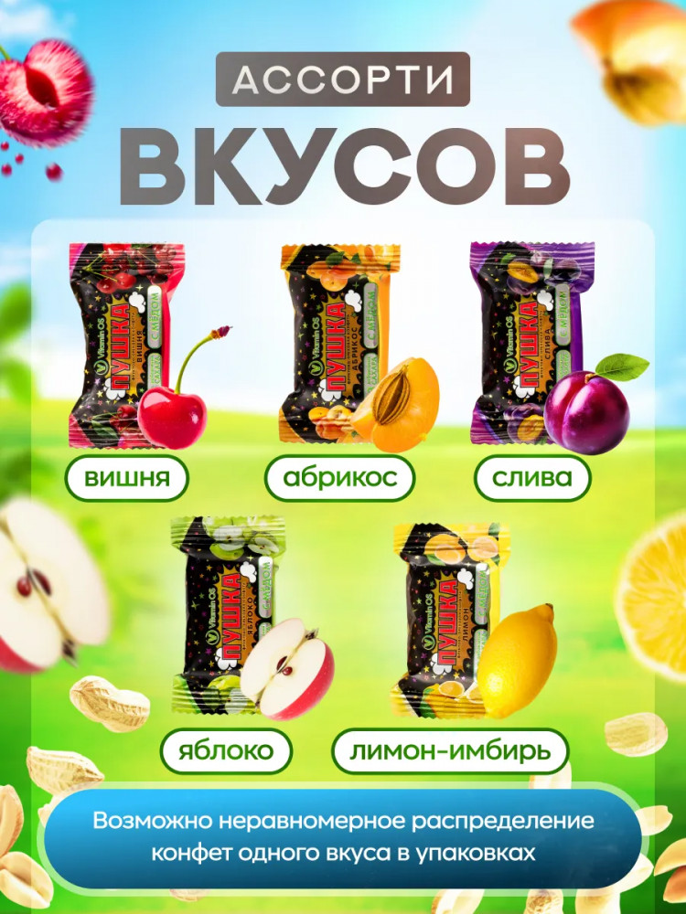 VitaminOS Конфеты фруктово-ореховые ассорти с мёдом Пушка «Абрикос, лимон, яблоко, вишня, слива»