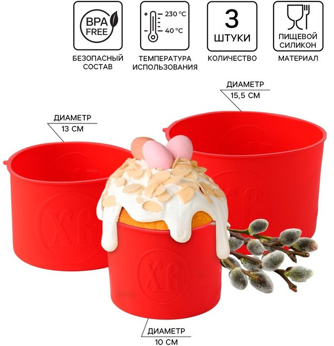 Отличный набор для пасхальной выпечки! Формы просто супер! Пользовалась ими на Пасху — тесто не прилипает, выпекается равномерно, легко вынимается после остывания. Силикон плотный, формы не теряют форму, не пахнут пластиком. Цвет яркий, приятный. Удобно, что в наборе сразу три формы — сделала куличи разного размера. Моются легко, можно и в посудомойку. В целом, довольна покупкой, особенно за такую цену.