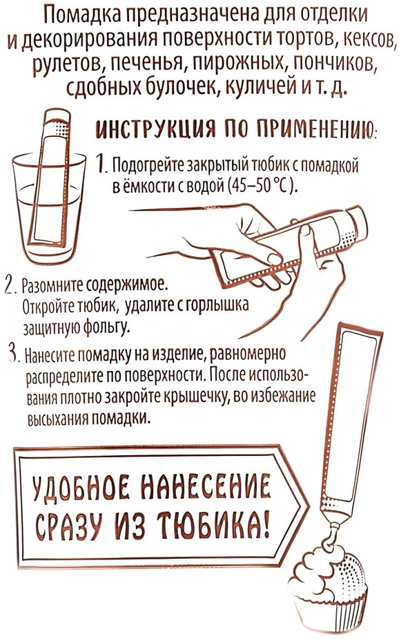 Приобрела все цвета данной глазури. Тюбик напоминает небольшой тюбик зубной пасты. Отверстие такое же.Согласно инструкции выдержала перед употреблением в кипятке, затем размяла руками. Использовала для украшения рождественского печенья,смазывала верх изделия. Тонко мазать из тюбика не получается, поэтому расход вышел такой - один тюбик на 15 штук печенюшек среднего размера.Не растекается.А сверху еще расписала глазурью из тюбика с узким носиком,приобретенную здесь же.Получилось довольно красиво. На вкус глазурь сладкая.Результатом осталась довольна.